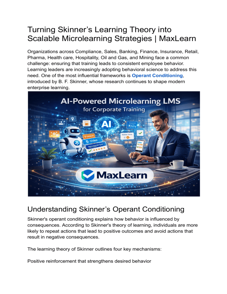 Turning Skinner’s Learning Theory into Scalable Microlearning Strategies | MaxLearn Organizations across Compliance, Sales, Banking, Finance, Insurance, Retail, Pharma, Health care, Hospitality, Oil and Gas, and Mining face a common challenge: ensuring that training leads to consistent employee behavior. Learning leaders are increasingly adopting behavioral science to address this need. One of the most influential frameworks is Operant Conditioning, introduced by B. F. Skinner, whose research continues to shape modern enterprise learning. Understanding Skinner’s Operant Conditioning Skinner's operant conditioning explains how behavior is influenced by consequences. According to Skinner's theory of learning, individuals are more likely to repeat actions that lead to positive outcomes and avoid actions that result in negative consequences. The learning theory of Skinner outlines four key mechanisms: Positive reinforcement that strengthens desired behavior Negative reinforcement that removes barriers after correct actions Punishment that discourages incorrect behavior An extinction that reduces behavior when reinforcement is removed These principles, often referred to as Skinnerian conditioning, highlight the importance of feedback and repetition. Many learning theories Skinner developed emphasize that immediate reinforcement plays a critical role in shaping behavior. Insights from Skinner’s Experiment Skinner's experiment demonstrated that behavior can be shaped over time through structured reinforcement. By observing how responses changed under different conditions, he showed that consistent feedback leads to predictable learning outcomes. Skinner's learning theory is highly relevant to corporate training. Employees perform better when learning experiences include frequent feedback and opportunities for repeated practice. However, traditional training methods often lack these elements, resulting in limited retention and application. This gap has led organizations to adopt microlearning platforms that align more closely with behavioral learning principles. Applying Skinner’s Learning Theories in Microlearning Platforms Microlearning platforms provide an effective environment for applying Skinner's learning theories. A Microlearning Platform delivers short, focused learning experiences that support continuous engagement and reinforcement. Microlearning courses designed around operant conditioning typically include: Scenario-based exercises that reflect real workplace challenges Immediate feedback to reinforce correct responses Recognition systems that encourage engagement Repetition that strengthens knowledge retention Microlearning tools and Microlearning Software enable organizations to build structured learning journeys. A microlearning application ensures that employees can access training when needed, supporting ongoing skill development. AI-Powered Microlearning LMS for Corporate Training An AI-powered microlearning LMS for corporate training enhances the effectiveness of reinforcement-based learning by personalizing the experience for each learner. These platforms analyze performance data to identify knowledge gaps and recommend targeted microlearning courses. Modern microlearning LMS solutions provide: Adaptive learning paths based on individual progress Real-time insights into learner performance Continuous recommendations for skill development Microlearning authoring tools also play a critical role by enabling L&D teams to create interactive content aligned with business goals. These capabilities allow organizations to deliver training across industries, from Banking and Finance to Healthcare and Oil and Gas. Driving Learning Impact with MaxLearn The integration of Skinner's operant conditioning into digital learning environments allows organizations to move beyond traditional training approaches. By applying the learning theory of Skinner through microlearning platforms, enterprises can create learning experiences that influence behavior and improve performance. MaxLearn combines behavioral science with advanced microlearning software to deliver scalable training solutions. Its AI-powered Microlearning LMS for corporate training enables organizations to design impactful microlearning courses that support compliance, enhance productivity, and strengthen workforce capability. For modern enterprises, aligning Skinner's learning theories with microlearning platforms provides a practical path to achieving measurable learning outcomes.