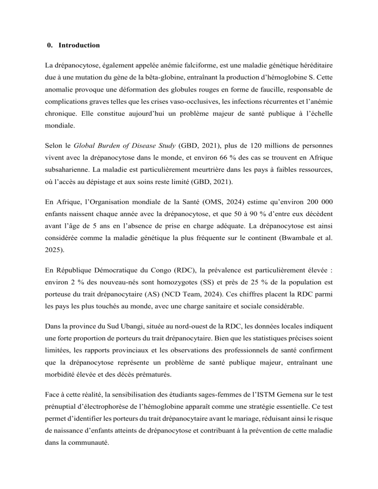 0. Introduction La drépanocytose, également appelée anémie falciforme, est une maladie génétique héréditaire due à une mutation du gène de la bêta-globine, entraînant la production d’hémoglobine S. Cette anomalie provoque une déformation des globules rouges en forme de faucille, responsable de complications graves telles que les crises vaso-occlusives, les infections récurrentes et l’anémie chronique. Elle constitue aujourd’hui un problème majeur de santé publique à l’échelle mondiale. Selon le Global Burden of Disease Study (GBD, 2021), plus de 120 millions de personnes vivent avec la drépanocytose dans le monde, et environ 66 % des cas se trouvent en Afrique subsaharienne. La maladie est particulièrement meurtrière dans les pays à faibles ressources, où l’accès au dépistage et aux soins reste limité (GBD, 2021). En Afrique, l’Organisation mondiale de la Santé (OMS, 2024) estime qu’environ 200 000 enfants naissent chaque année avec la drépanocytose, et que 50 à 90 % d’entre eux décèdent avant l’âge de 5 ans en l’absence de prise en charge adéquate. La drépanocytose est ainsi considérée comme la maladie génétique la plus fréquente sur le continent (Bwambale et al. 2025). En République Démocratique du Congo (RDC), la prévalence est particulièrement élevée : environ 2 % des nouveau-nés sont homozygotes (SS) et près de 25 % de la population est porteuse du trait drépanocytaire (AS) (NCD Team, 2024). Ces chiffres placent la RDC parmi les pays les plus touchés au monde, avec une charge sanitaire et sociale considérable. Dans la province du Sud Ubangi, située au nord-ouest de la RDC, les données locales indiquent une forte proportion de porteurs du trait drépanocytaire. Bien que les statistiques précises soient limitées, les rapports provinciaux et les observations des professionnels de santé confirment que la drépanocytose représente un problème de santé publique majeur, entraînant une morbidité élevée et des décès prématurés. Face à cette réalité, la sensibilisation des étudiants sages-femmes de l’ISTM Gemena sur le test prénuptial d’électrophorèse de l’hémoglobine apparaît comme une stratégie essentielle. Ce test permet d’identifier les porteurs du trait drépanocytaire avant le mariage, réduisant ainsi le risque de naissance d’enfants atteints de drépanocytose et contribuant à la prévention de cette maladie dans la communauté. 1. Contexte et justification La drépanocytose est une maladie génétique héréditaire qui constitue un problème majeur de santé publique dans le monde, particulièrement en Afrique subsaharienne. En effet, près de 5 à 10% des personnes de cette région sont porteuses du gène de la drépanocytose, ce qui fait de la détection précoce un enjeu primordial. En république démocratique du Congo, la situation est alarmante : les estimations indiquent 3 à 5% de la population est affectée par cette maladie, avec environ 20 à 25% des individus étant porteurs Sains du gène. Le test d'électrophorèse d'hémoglobine, qui permet de différencier les différentes formes d'hémoglobine dans le sang, est une méthode simple et efficace pour identifier les personnes à risque. Le test d'électrophorèse de l'hémoglobine réalisé avant le mariage, permet d'identifier les porteurs Sains et de prévenir la transmission de maladies génétiques graves aux enfants. Face à cette situation, le dépistage prénuptial par électrophorèse de l’hémoglobine apparaît comme une stratégie efficace pour prévenir la naissance d’enfants atteints de drépanocytose. Cependant, ce test reste peu connu et rarement pratiqué dans plusieurs communautés, notamment en milieu rural. La sensibilisation des futurs professionnels de santé est donc une étape cruciale pour renforcer la prévention et la prise en charge. Le choix des étudiants de sage-femme de l’ISTM Gemena se justifie par leur rôle central dans la santé maternelle et infantile. En effet, les sages-femmes sont souvent les premiers professionnels de santé en contact avec les couples et les familles, particulièrement dans les zones rurales où l’accès aux médecins spécialistes est limité. Elles jouent un rôle clé dans l’éducation sanitaire, le conseil prénatal et la prévention des maladies génétiques. En les sensibilisant au test prénuptial d’électrophorèse de l’hémoglobine, on renforce leur capacité à informer les couples sur les risques liés à la drépanocytose, à promouvoir le dépistage avant le mariage et à contribuer à la réduction de la transmission de cette maladie. Leur implication constitue ainsi une stratégie durable et efficace pour améliorer la santé publique dans la province du Sud Ubangi et ses environs. 2. Définition des priorités du projet La drépanocytose demeure une pathologie génétique de grande ampleur en République Démocratique du Congo, particulièrement dans la province du Sud Ubangi où la prévalence du trait drépanocytaire est élevée. Dans ce contexte, la mise en œuvre d’un projet de sensibilisation sur le test prénuptial d’électrophorèse de l’hémoglobine auprès des étudiants sages-femmes de l’ISTM Gemena nécessite une hiérarchisation claire des priorités afin d’assurer son efficacité. 1. Sensibilisation: La sensibilisation constitue la priorité principale du projet. Elle vise à : - Informer les étudiants sages-femmes sur l’importance du test prénuptial d’électrophorèse de l’hémoglobine. Expliquer les maladies détectées par ce test, notamment la drépanocytose et les thalassémies. Souligner le rôle crucial des sages-femmes dans l’éducation sanitaire et le conseil prénuptial. Promouvoir la prévention des maladies héréditaires dans la communauté. Cette étape permet de renforcer les connaissances théoriques et d’encourager une attitude proactive dans la prévention des hémoglobinopat