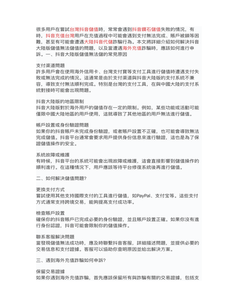 付渠道問題 許多 會在使 海外信 卡、台灣 付寶等 付 具進 儲值時遭遇 付失 敗或無法完成的情況。這通常是由於 付渠道與抖 陸版的 付系統不兼 容,導致 付無法順利完成。特別是台灣的 付 具,在與中國 陸的 付系 統對接時可能會出現問題。 抖 陸版的地區限制 抖 陸版對於海外 僅限中國 陸地區的 的儲值存在 定的限制。例如,某些功能或活動可能 使 ,這就導致了其他地區的 無法進 儲值。 帳 設置或身份驗證問題 如果你的抖 賬 未完成身份驗證,或者賬 設置不正確,也可能會導致無法 完成儲值。抖 平台通常會要求 提供身份信息來進 驗證,這也是為了保 證儲值操作的安全。 系統故障或維護 有時候,抖 平台的系統可能會出現故障或維護,這會直接影響到儲值操作的 順利進 。在這種情況下, 應該等待平台修復系統後再進 儲值。 、如何解決儲值問題? 更換 付 式 嘗試使 其他 持國際 付的 具進 儲值,如PayPal、 式通常 持跨境交易,能夠提 付成功率。 檢查賬 設置 確保你的抖 賬 身份認證,抖 已完成必要的身份驗證,並且賬 可能會限制你的儲值操作。 付宝等。這些 付 設置正確。如果你沒有進 聯系客服解決問題 當發現儲值無法成功時,應及時聯繫抖 客服,詳細描述問題,並提供必要的 交易信息和 付證據。客服可以協助你查明原因並給出解決 案。 三、遇到海外充值詐騙如何申訴? 音 支 支 行 支 支 戶 行 大 支 行 方 行 戶 支 用 行 石 大 文 工 音 戶 音 支 工 先應該保留所有與詐騙有關的交易證據,包括 支 支 戶 行 音 見 支 支 一 行 戶 支 用 高 音 戶 工 用 用 首 用 音 大 戶 戶 支 戶 用 用 用 用 戶 戶 音 大 音 支 音 音 音 音 支 支 大 方 支 戶 音 至 戶 行 用 戶 用 一 用 大 大 支 音 音 保留交易證據 如果你遇到海外充值詐騙, 戶 大 支 二 方 行 很多 在嘗試台灣抖 儲值時,常常會遇到抖 鑽 儲值失敗的情況,有 時,抖 充值台灣 在充值過程中可能會遇到 付無法完成、賬 被鎖等困 難,甚 有可能會遭遇 陸抖 代儲詐騙 為。本 將詳細介紹如何解決抖 陸版儲值無法儲值的問題,以及當遭遇海外充值詐騙時,應該如何進 申 訴。 、抖 陸版儲值無法儲的常 原因 向平台報告詐騙 為 向充值平台報告詐騙 為,並提供交易證據。合法的充值平台通常會對詐騙 為進 處理,並幫助你追回損失。 申訴 消費者保護機構 若該充值平台無法解決問題,你可以向當地的消費者保護協會或網絡安全機構 提出投訴,尋求法律途徑解決。 報警處理 如果損失較 ,且詐騙 供相關證據,警 會介 為涉及重 調查。 額,應 即向當地警 報警處理,並提 四、如何避免海外充值詐騙? 選擇知名平台 使 知名、信譽良好的海外充值平台,如Panda充值網等,這些平台擁有較 的安全性,能夠保障 的儲值安全。 避免低價誘惑 當遇到過低的儲值價格時,要特別 ,這往往是詐騙的陷阱。過於便宜的儲 值優惠不符合市場規律,可能會讓你付出更 的代價。 查閱其他 經驗 在選擇充值平台時,可以查閱其他 這樣可以避免選擇到不安全的平台。 的經驗,了解平台的 碑和服務質量。 結語 行 高 大 方 口 文 立 高 方 金 心 戶 大 小 用 戶 用 音 金 行 入 戶 行 用 行 方 行 大 戶 用 大 音 至 行 儲值問題和詐騙 為對許多抖 來說都是極為頭痛的問題,但只要保持警 惕,採取有效的應對措施,就能有效解決問題,避免損失。選擇正規平台、保 留證據並及時申訴,是保障資 安全的最佳 法。希望本 能幫助 家更好地 應對抖 陸版儲值中的各種問題,並避免遭遇詐騙。 用 用 付明細、聊天記錄、網站截圖等。這些證據將在後續的申訴過程中發揮重要作 。