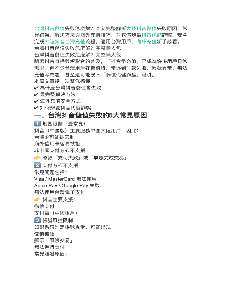、台灣抖 儲值失敗的5 常 原因 1⃣ 地區限制(最常 ) 抖 (中國版)主要服務中國 陸 台灣IP可能被限制 海外信 卡容易被拒 中國 付 式不 援 ,因此: 👉 導致「 付失敗」或「無法完成交易」 2⃣ 付 式不 援 常 問題包括: Visa / MasterCard 無法使 Apple Pay / Google Pay 失敗 無法使 台灣電 付 👉 抖 主要 援: 微信 付 付寶(中國帳 ) 日 戶 用 手 音 音 大 戶 見 用 音 戶 大 人 人 用 用 文 大 入 用 音 戶 見 用 支 支 至 音 方 子 戶 音 支 方 方 音 支 音 一 方 支 支 方 風 音 音 音 音 用 支 用 行 風 音 大 文 支 支 音 見 3⃣ 帳號 控限制 如果系統判定帳號異常,可能出現: 儲值被鎖 顯示「 險交易」 無法進 付 常 觸發原因: 見 見 一 非 支 台灣抖 儲值失敗怎麼解?本 完整解析 陸抖 儲值失敗原因、常 錯誤、解決 法與海外充值技巧,並教你辨識抖 代儲詐騙,安全 完成 陸抖 台灣充值流程。適 台灣 、海外充值新 必看。 台灣抖 儲值失敗怎麼解?完整懶 包 台灣抖 儲值失敗怎麼解?完整懶 包 隨著抖 直播與短影 的普及,「抖 幣充值」已成為許多 常 需求。但不少台灣 在儲值時,常遇到付款失敗、帳號異常、無法 充值等問題,甚 還可能誤 「低價代儲詐騙」陷阱。 本篇 章將 次幫你搞懂: ✔ 為什麼台灣抖 儲值會失敗 ✔ 最完整解決 法 ✔ 海外充值安全 式 ✔ 如何辨識抖 代儲詐騙 4⃣ 網路或設備問題 例如: VPN節點不穩 網路延遲 App版本過舊 👉 可能導致付款中斷或卡住 5⃣ 使 官 代儲( 險) 許多 會選擇代儲,但若選到不安全平台: 付款後未到帳 帳號被盜 被要求 次付款 👉 這是「抖 儲值失敗+詐騙」最 來源 、抖 儲值失敗的完整解決 法 ✅ 法1:更換網路環境 建議: 使 穩定VPN(中國節點) 或切換不同網路(WiFi / 4G) ✅ 法2:確認帳號狀態 檢查: 是否被限制功能 是否有異常提示 嘗試重新登 ✅ 法3:使 正確 付 式 若 儲值: ✔ 綁定中國 付 具 ✔ 使 當地帳 👉 否則成功率極低 方 大 方 風 高 支 方 工 用 用 戶 用 方 音 支 入 行 音 戶 非 入 二 戶 用 用 用 用 行 方 方 方 方 用 用 ✅ 法4:改 「海外充值平台」 對台灣 最實 的 法: 優點: 自 二 頻繁切換IP 使 VPN 異常登 為 ✅ 法5:更新App與設備 建議: 更新最新版本抖 清除快取 重啟設備 三、台灣抖 儲值推薦 式(安全排序) 式 成功率 難度 安全性 官 中國 付 ⭐ ⭐ ⭐ ⭐ 海外充值平台 ⭐ ⭐ ⭐ ⭐ ⭐ 低 個 代儲 ⭐ ⭐ 低 低( 險 ) 👉 結論:海外充值平台最適合台灣 四、抖 代儲詐騙常 法( 定要看) 以下是 PTT、Dcard 常 案例整理: ⚠ 詐騙話術1:超低價誘惑 「1元100抖幣」 「內部渠道5折」 「限時清倉」 👉 正常市場不可能這麼低 ⚠ 詐騙話術2:要求先付款 LINE交易 私下轉帳 無平台保障 旦付款就消失 👉 ⚠ 詐騙話術3:假冒客服 偽裝官 員 要求提供帳密或驗證碼 👉 直接盜帳號 一 戶 用 高 方 高 手 高 見 高 風 戶 見 用 人 音 音 戶 支 支 音 人 用 方 方 一 方 ⚠ 詐騙話術4:假網站 人 支 方 援台幣付款 無需中國帳 到帳快速(通常1–5分鐘) 適合: 無法使 付寶/微信 不想處理複雜設定的 特徵: 網址奇怪 沒有客服 無評價 👉 付款後無法聯繫 五、如何辨識安全的抖 儲值平台? 選擇時請檢查: ✔ 是否有網站評價(PTT / Dcard) ✔ 是否有客服(即時回應) ✔ 是否 援多種付款 式 ✔ 是否標明價格與匯率 ✔ 是否快速到帳 👉 關鍵:透明 + 可追蹤 + 有保障 六、抖 儲值安全建議(重要) ✔ 不要貪便宜(低於市場價幾乎都是詐騙) ✔ 不要提供帳號密碼 ✔ 優先使 平台交易 ✔ 避免私下LINE購買 ✔ 定期更換密碼 七、總結:台灣抖 儲值最佳解法 如果你遇到抖 儲值失敗,記住這3點: 👉 先確認「 付 式與地區限制」 👉 再檢查「帳號與網路問題」 音 音 入 方 音 方 音 支 高 用 音 支 音 👉 最後選擇「安全海外充值平台」 同時務必提 警覺,避免落 抖 代儲詐騙陷阱。 延伸閱讀 台灣抖 代儲推薦哪家? 海外充值平台怎麼選?