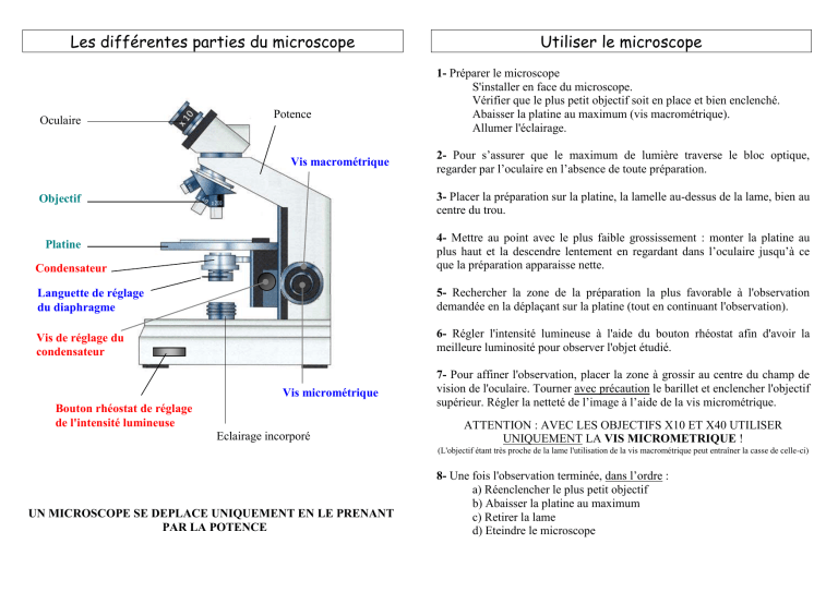 Les différentes parties du microscope Oculaire Potence Vis macrométrique Utiliser le microscope 1- Préparer le microscope S'installer en face du microscope. Vérifier que le plus petit objectif soit en place et bien enclenché. Abaisser la platine au maximum (vis macrométrique). Allumer l'éclairage. 2- Pour s’assurer que le maximum de lumière traverse le bloc optique, regarder par l’oculaire en l’absence de toute préparation. 3- Placer la préparation sur la platine, la lamelle au-dessus de la lame, bien au centre du trou. Objectif Condensateur 4- Mettre au point avec le plus faible grossissement : monter la platine au plus haut et la descendre lentement en regardant dans l’oculaire jusqu’à ce que la préparation apparaisse nette. Languette de réglage du diaphragme 5- Rechercher la zone de la préparation la plus favorable à l'observation demandée en la déplaçant sur la platine (tout en continuant l'observation). Vis de réglage du condensateur 6- Régler l'intensité lumineuse à l'aide du bouton rhéostat afin d'avoir la meilleure luminosité pour observer l'objet étudié. Platine Vis micrométrique Bouton rhéostat de réglage de l'intensité lumineuse Eclairage incorporé 7- Pour affiner l'observation, placer la zone à grossir au centre du champ de vision de l'oculaire. Tourner avec précaution le barillet et enclencher l'objectif supérieur. Régler la netteté de l’image à l’aide de la vis micrométrique. ATTENTION : AVEC LES OBJECTIFS X10 ET X40 UTILISER UNIQUEMENT LA VIS MICROMETRIQUE ! (L'objectif étant très proche de la lame l'utilisation de la vis macrométrique peut entraîner la casse de celle-ci) UN MICROSCOPE SE DEPLACE UNIQUEMENT EN LE PRENANT PAR LA POTENCE 8- Une fois l'observation terminée, dans l’ordre : a) Réenclencher le plus petit objectif b) Abaisser la platine au maximum c) Retirer la lame d) Eteindre le microscope