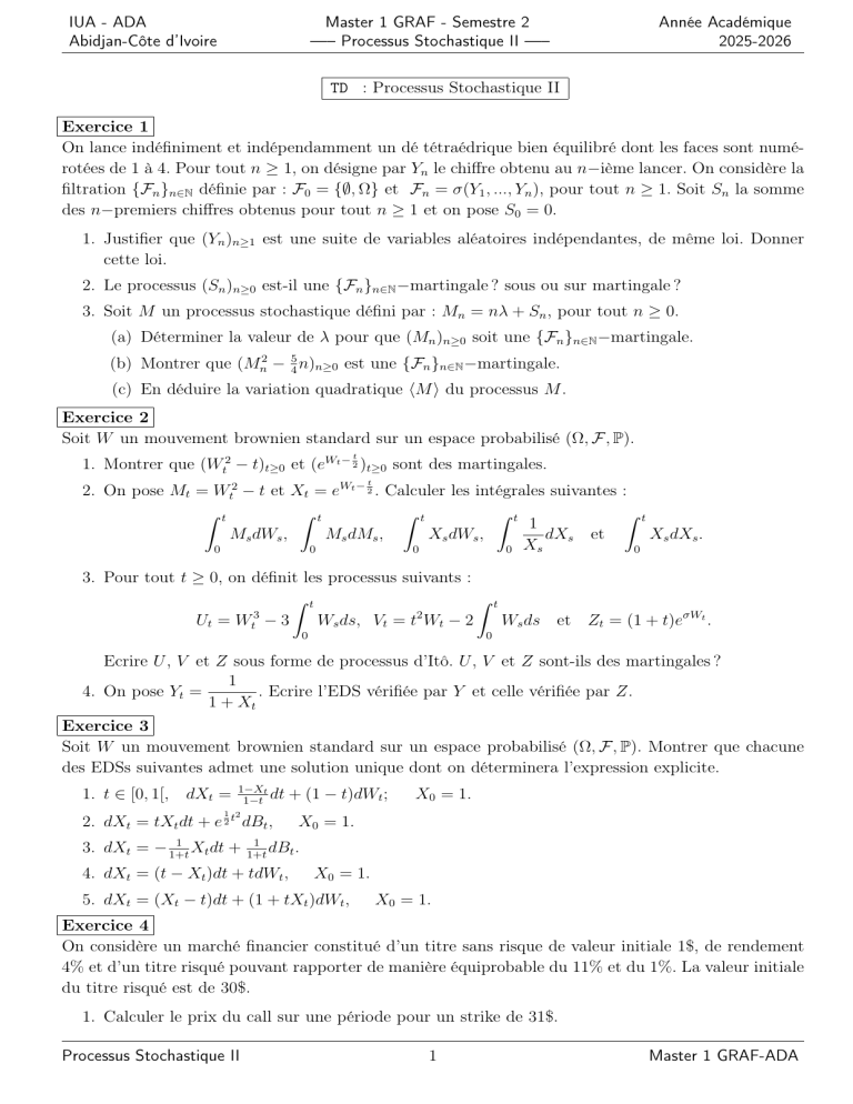 2. On pose Mt = Wt2 − t et Xt = eWt − 2 . Calculer les intégrales suivantes :