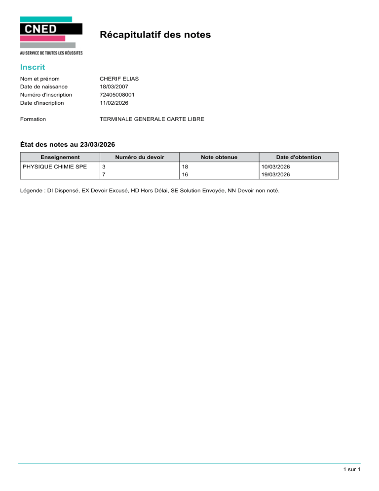 Récapitulatif des notes Inscrit Nom et prénom CHERIF ELIAS Date de naissance 18/03/2007 Numéro d'inscription 72405008001 Date d'inscription 11/02/2026 Formation TERMINALE GENERALE CARTE LIBRE État des notes au 23/03/2026 Enseignement PHYSIQUE CHIMIE SPE Numéro du devoir 3 7 Note obtenue 18 16 Date d'obtention 10/03/2026 19/03/2026 Légende : DI Dispensé, EX Devoir Excusé, HD Hors Délai, SE Solution Envoyée, NN Devoir non noté. 1 sur 1