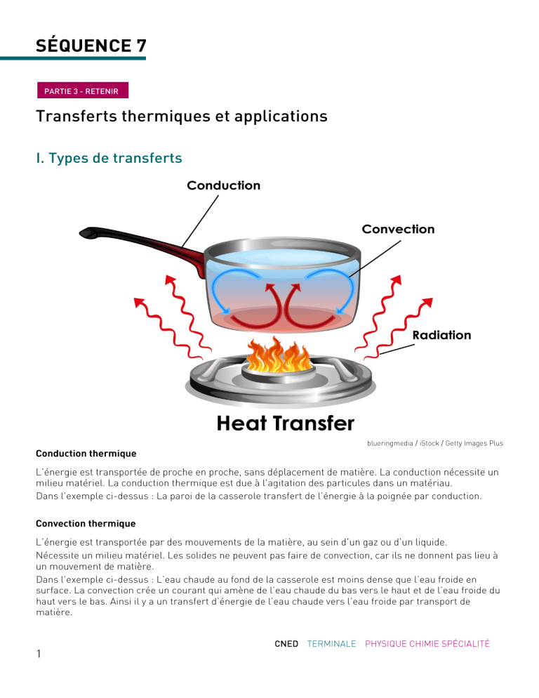 SÉQUENCE 7 PARTIE 3 - RETENIR I. Types de transferts Dans l’exemple ci-dessus : La paroi de la casserole transfert de l’énergie à la poignée par conduction. Dans l’exemple ci-dessus : L’eau chaude au fond de la casserole est moins dense que l’eau froide en surface. La convection crée un courant qui amène de l’eau chaude du bas vers le haut et de l’eau froide du haut vers le bas. Ainsi il y a un transfert d’énergie de l’eau chaude vers l’eau froide par transport de matière. Dans l’exemple ci-dessus : Les flammes ont une température élevée et donc rayonnent grandement dans toutes les directions. II. Étude quantitative de la conduction thermique Φ= Q Δt τ R th = e S λ th − λ th Φ = T1 - T2 ΔT = R th R th Φ = S Q ΔT = = ( Tcorps humain - Tobjet ) th Δt R th e λ III. Bilan thermique du système Terre / atmosphère Psurfacique = σ ε T − − − σ= - σ - Cette formule n’est pas à connaitre par cœur mais à savoir utiliser IV. Loi phénoménologique de Newton : Modélisation d’une évolution de la température Δ = Δ Δ = =− Δ ΔT Δ = Δ Δ = = =− Δ Δ Δ = − ΔT = = −h S ΔT dt = Csystème dTsystème =− Δ =− ( ) ( )− 𝑟= ℎ×𝑆 𝐶syst me ( )= • ( − − + − )=− =− ( ( − − − + − + • ( ) − + − ) = − ( = )= ( )=( + ) − − =− − ) − + − + − = = = = = − = 1 𝜏 = 𝑟 = 𝑟 −1 = h= Csystème τ×S 𝐶syst me ℎ×𝑆