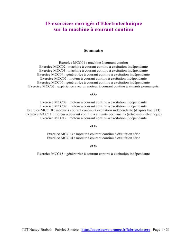 15 exercices corrigés d’Electrotechnique sur la machine à courant continu Sommaire Exercice MCC01 : machine à courant continu Exercice MCC02 : machine à courant continu à excitation indépendante Exercice MCC03 : machine à courant continu à excitation indépendante Exercice MCC04 : génératrice à courant continu à excitation indépendante Exercice MCC05 : moteur à courant continu à excitation indépendante Exercice MCC06 : génératrice à courant continu à excitation indépendante Exercice MCC07 : expérience avec un moteur à courant continu à aimants permanents oOo Exercice MCC08 : moteur à courant continu à excitation indépendante Exercice MCC09 : moteur à courant continu à excitation indépendante Exercice MCC10 : moteur à courant continu à excitation indépendante (d’après bac STI) Exercice MCC11 : moteur à courant continu à aimants permanents (rétroviseur électrique) Exercice MCC12 : moteur à courant continu à excitation indépendante oOo Exercice MCC13 : moteur à courant continu à excitation série Exercice MCC14 : moteur à courant continu à excitation série oOo Exercice MCC15 : génératrice à courant continu à excitation indépendante IUT Nancy-Brabois Fabrice Sincère http://pagesperso-orange.fr/fabrice.sincere Page 1 / 31 Exercice MCC01 : machine à courant continu Un moteur de puissance utile 3 kW tourne à 1500 tr/min. Calculer le couple utile en Nm. Exercice MCC02 : machine à courant continu à excitation indépendante La force électromotrice d’une machine à excitation indépendante est de 210 V à 1500 tr/min. Calculer la fem pour une fréquence de rotation de 1000 tr/min, le flux étant constant. Exercice MCC03 : machine à courant continu à excitation indépendante 1- Un moteur à excitation indépendante alimenté sous 220 V possède une résistance d’induit de 0,8 Ω. A la charge nominale, l’induit consomme un courant de 15 A. Calculer la f.e.m. E du moteur. 2- La machine est maintenant utilisée en génératrice (dynamo). Elle débite un courant de 10 A sous 220 V. En déduire la f.e.m. Exercice MCC04 : génératrice à courant continu à excitation indépendante Une génératrice à excitation indépendante fournit une fem de 220 V pour un courant d’excitation de 3,5 A. La résistance de l’induit est de 90 mΩ. Calculer la tension d’induit U lorsqu’elle débite 56 A dans le circuit de charge. Exercice MCC05 : moteur à courant continu à excitation indépendante La plaque signalétique d’un moteur à courant continu à excitation indépendante indique : 1,12 kW induit excitation 57 kg 1200 tr/min 220 V 220 V 5,7 A 0,30 A 1- Calculer le couple utile nominal (en Nm). 2- Calculer le rendement nominal. IUT Nancy-Brabois Fabrice Sincère http://pagesperso-orange.fr/fabrice.sincere Page 2 / 31 Exercice MCC06 : génératrice à courant continu à excitation indépendante La plaque signalétique d’une génératrice à courant continu à excitation indépendante indique : 11,2 Nm induit excitation masse 1500 tr/min 220 V 220 V 38 kg 6,8 A 0,26 A 1- Calculer la puissance mécanique consommée au fonctionnement nominal. 2- Calculer la puissance consommée par l’excitation. 3- Calculer la puissance utile. 4- En déduire le rendement nominal. Exercice MCC07 : expérience avec un moteur à courant continu à aimants permanents Un moteur à courant continu à aimants permanents est couplé à un volant d’inertie (disque massif) : 1- On place le commutateur en position 1 : le moteur démarre et atteint sa vitesse nominale. On place ensuite le commutateur en position 2 : Le moteur s’emballe Le moteur change de sens de rotation Le moteur s’arrête lentement Le moteur s’arrête rapidement (Cocher la ou les bonnes réponses) 2- On place à nouveau le commutateur en position 1. Puis on commute en position 3. 2-1- Que se passe-t-il ? 2-2- Que se passe-t-il si on diminue la valeur de la résistance R ? 2-3- Donner une application pratique. IUT Nancy-Brabois Fabrice Sincère http://pagesperso-orange.fr/fabrice.sincere Page 3 / 31 Exercice MCC08 : moteur à courant continu à excitation indépendante Un moteur à courant continu à excitation indépendante et constante est alimenté sous 240 V. La résistance d’induit est égale à 0,5 Ω, le circuit inducteur absorbe 250 W et les pertes collectives s’élèvent à 625 W. Au fonctionnement nominal, le moteur consomme 42 A et la vitesse de rotation est de 1200 tr/min. 1- Calculer : - la f.e.m. - la puissance absorbée, la puissance électromagnétique et la puissance utile - le couple utile et le rendement 2- Quelle est la vitesse de rotation du moteur quand le courant d’induit est de 30 A ? Que devient le couple utile à cette nouvelle vitesse (on suppose que les pertes collectives sont toujours égales à 625 W) ? Calculer le rendement. Exercice MCC09 : moteur à courant continu à excitation indépendante La plaque signalétique d’un moteur à excitation indépendante porte les indications suivantes : U = 240 V P = 7 kW I = 35 A n = 800 tr/min Calculer (à la charge nominale): 1- Le rendement du moteur sachant que les pertes Joule inducteur sont de 150 watts. 2- Les pertes Joule induit sachant que l’induit a une résistance de 0,5 Ω. 3- La puissance électromagnétique et les pertes « constantes ». 4- Le couple électromagnétique, le couple utile et le couple des pertes « constantes ». IUT Nancy-Brabois Fabrice Sincère http://pagesperso-orange.fr/fabrice.sincere Page 4 / 31 Exercice MCC10 : moteur à courant continu à excitation indépendante (d’après bac STI) Une machine d'extraction est entraînée par un moteur à courant continu à excitation indépendante. L'inducteur est alimenté par une tension u = 600 V et parcouru par un courant d'excitation d'intensité constante : i = 30 A. L'induit de résistance R = 12 mΩ est alimenté par une source fournissant une tension U réglable de 0 V à sa valeur nominale : UN = 600 V. L'intensité I du coura