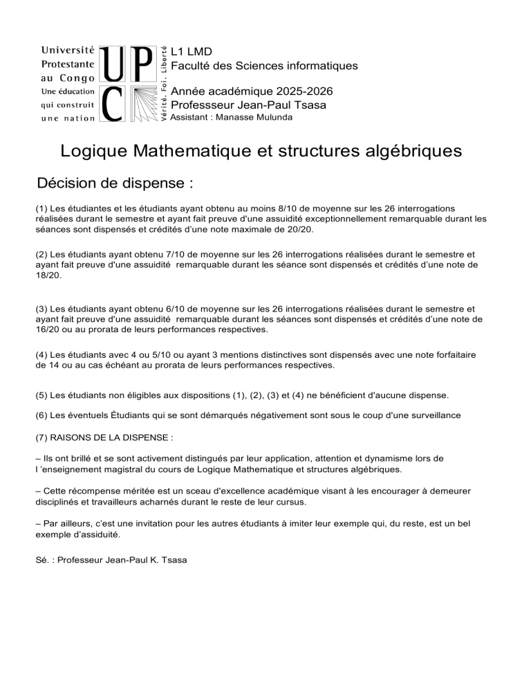 L1 LMD Faculté des Sciences informatiques Année académique 2025-2026 Professseur Jean-Paul Tsasa Assistant : Manasse Mulunda Logique Mathematique et structures algébriques Décision de dispense : (1) Les étudiantes et les étudiants ayant obtenu au moins 8/10 de moyenne sur les 26 interrogations réalisées durant le semestre et ayant fait preuve d'une assuidité exceptionnellement remarquable durant les séances sont dispensés et crédités d’une note maximale de 20/20. (2) Les étudiants ayant obtenu 7/10 de moyenne sur les 26 interrogations réalisées durant le semestre et ayant fait preuve d'une assuidité remarquable durant les séance sont dispensés et crédités d’une note de 18/20. (3) Les étudiants ayant obtenu 6/10 de moyenne sur les 26 interrogations réalisées durant le semestre et ayant fait preuve d'une assuidité remarquable durant les séances sont dispensés et crédités d’une note de 16/20 ou au prorata de leurs performances respectives. (4) Les étudiants avec 4 ou 5/10 ou ayant 3 mentions distinctives sont dispensés avec une note forfaitaire de 14 ou au cas échéant au prorata de leurs performances respectives. (5) Les étudiants non éligibles aux dispositions (1), (2), (3) et (4) ne bénéficient d'aucune dispense. (6) Les éventuels Étudiants qui se sont démarqués négativement sont sous le coup d'une surveillance (7) RAISONS DE LA DISPENSE : – Ils ont brillé et se sont activement distingués par leur application, attention et dynamisme lors de l ’enseignement magistral du cours de Logique Mathematique et structures algébriques. – Cette récompense méritée est un sceau d'excellence académique visant à les encourager à demeurer disciplinés et travailleurs acharnés durant le reste de leur cursus. – Par ailleurs, c’est une invitation pour les autres étudiants à imiter leur exemple qui, du reste, est un bel exemple d’assiduité. Sé. : Professeur Jean-Paul K. Tsasa Sont dispensés, les étudiants suivants : MOYENNE INTERROGATION MOYENNE DEVOIR EXAMEN TOTAL 6 22 44 45 114 116 129 143 144 149 160 162 194 206 233 241 261 299 308 331 337 346 351 368 393 616 Akilimali Banza Bolinde Bongo Kalambayi Kalemba Kanda Kawata Kayembe Kianawa Kitoga Kivuvu Mabiala Mananga Mbomba Minga Mukay Ndingo Ngandu Nseke Nteteubaka Nzola Penge Taminga Wawa Mawanga Khonde Mutombo Banatshinyi Elaye Mukendi Mckenzie Wa Kande Imbel Kapepula Bora Imani Lubenzo Mutombo Kanku Nkoy-Lokope Kweti Bukasa Lusanga Tshienda Ndofula Toko Nzazi Wendilungu Minga Ndoboyi Mawanga Josue Theodore Agnes Daniel Aaron Bellange Nathan Benjus David Emmanuella Gabriel Emmanuel Moïse Emmanuella Jean-Pierre Bernard-Winner Leance Marise Benjamin Ange Abner Veron Profil Emmanuel Marcel Divine 6,0 6,0 6,0 6,0 6,0 6,0 6,0 6,0 6,0 6,0 6,0 6,0 6,0 6,0 6,0 6,0 6,0 6,0 6,0 6,0 6,0 6,0 6,0 6,0 6,0 6,0 6,0 6,0 6,0 6,0 6,0 6,0 6,0 6,0 6,0 6,0 6,0 6,0 6,0 6,0 6,0 6,0 6,0 6,0 6,0 6,0 6,0 6,0 6,0 6,0 6,0 6,0 8,0 8,0 8,0 8,0 8,0 8,0 8,0 8,0 8,0 8,0 8,0 8,0 8,0 8,0 8,0 8,0 8,0 8,0 8,0 8,0 8,0 8,0 8,0 8,0 8,0 8,0 20,0 20,0 20,0 20,0 20,0 20,0 20,0 20,0 20,0 20,0 20,0 20,0 20,0 20,0 20,0 20,0 20,0 20,0 20,0 20,0 20,0 20,0 20,0 20,0 20,0 20,0 14 26 49 61 65 78 84 107 124 Balazire Basandja Boyeka Diakalenga Dianzenza Engasi Gala Kabuya Kalubi Anganze Liata Bekombe Kabangu Kuediatuka Nzap'aye Madira Dinanga Tenga Grady Angel Roukiya Destinée Eunice Jehovani Gad Mariam Plamedie 5,0 5,0 5,0 5,0 5,0 5,0 5,0 5,0 5,0 5,0 5,0 5,0 5,0 5,0 5,0 5,0 5,0 5,0 8,0 8,0 8,0 8,0 8,0 8,0 8,0 8,0 8,0 18,0 18,0 18,0 18,0 18,0 18,0 18,0 18,0 18,0 126 136 154 157 158 165 188 211 220 231 232 236 265 276 286 294 336 341 356 382 421 429 437 485 499 515 532 553 566 567 641 Kamba Kasongo Kinamvuidi Kionga Kirongozi Konzi Lukusa Mapela Mayamba Mbayi Mbazi Mbuyi Mukuna Munzo Mutombo Nabintu Ntete Nyembo Salumu Tshipalaba Mbala Ngebuka Tambwe Tshibangu Ngalula Kanku Mbuyi Kitoko D'oliveira Pasinya Mutaba Kapongo Nouvie Kiaku Khasa Ilanga Mpiana Mbuyi Bambiki Kumba Mukengela Nsaku Mulumba Mukuna Ngabu Bieba Karungu Nene Beia Kitanga Kabamba Mbombo Mugaruka Mugalu Diasivi Mulumba Meba Batty Lumumba Massanga Palata Risasi William Nouvie Daniella Espoir Bonheur Benjamin Ralex Micheline Gabriel Tred Merdi Miriam Eddy Albertine Bryan Furaha Marcel-Dylan Murielle Eureka Christian Benjamin Tresor Moise Gedeon Prunelle Patrick Allegra Dan Maoly Gemima Tiffany 5,0 5,0 5,0 5,0 5,0 5,0 5,0 5,0 5,0 5,0 5,0 5,0 5,0 5,0 5,0 5,0 5,0 5,0 5,0 5,0 5,0 5,0 5,0 5,0 5,0 5,0 5,0 5,0 5,0 5,0 5,0 5,0 5,0 5,0 5,0 5,0 5,0 5,0 5,0 5,0 5,0 5,0 5,0 5,0 5,0 5,0 5,0 5,0 5,0 5,0 5,0 5,0 5,0 5,0 5,0 5,0 5,0 5,0 5,0 5,0 5,0 5,0 8,0 8,0 8,0 8,0 8,0 8,0 8,0 8,0 8,0 8,0 8,0 8,0 8,0 8,0 8,0 8,0 8,0 8,0 8,0 8,0 8,0 8,0 8,0 8,0 8,0 8,0 8,0 8,0 8,0 8,0 8,0 18,0 18,0 18,0 18,0 18,0 18,0 18,0 18,0 18,0 18,0 18,0 18,0 18,0 18,0 18,0 18,0 18,0 18,0 18,0 18,0 18,0 18,0 18,0 18,0 18,0 18,0 18,0 18,0 18,0 18,0 18,0 24 28 30 43 54 56 60 73 74 Bapumbudia Basila Baswa Bokonga Bumba Bwas Diabo Ekila Elenga Kansia Bayamba Kapinga Mandala Kayembe Mapanda Bozenge Ilongo Ilonga Evodie André Beni Eshter Kimberly Joiedie Séraphine Merseigne Miriam 5,0 5,0 5,0 5,0 5,0 5,0 5,0 5,0 5,0 5,0 5,0 5,0 5,0 5,0 5,0 5,0 5,0 5,0 6,0 6,0 6,0 6,0 6,0 6,0 6,0 6,0 6,0 16,0 16,0 16,0 16,0 16,0 16,0 16,0 16,0 16,0 79 85 101 108 118 121 146 152 174 181 182 189 190 197 204 214 215 237 238 247 268 275 281 298 303 309 320 324 332 333 340 349 363 365 369 371 383 384 416 420 425 Essabe Hakala Kabamba Kadima Kalenga Kalonji Kazadi Kibungu Leba Lonkuka Lubaki Lumbala Lusamba Majamu Mambuya Masiala Masika Menge Miangala Mosamete Mulaja Munzimba Musawu N'Daie bukitu Ndusi Ngasiela Ngoyi Nsaka Nseya Nsiete Numbi Wa Numbi Pangula Simuko Swedi Tenga Togena Tshisekedi Tshishiku Mumbere Dyese Nkongolo Mboyo Mahahi Mukobo Mutombo Kabamba Matumba Kabamba Falanga Ntuangia Bonsemi Nkenge Meta Mpandajila Mukuta Obul'Okwess Dinene Bakala Selemani Bola Nzekama Mukendi Richesse Butoka Muka Katumbi Zola Kasongo Tshimena 