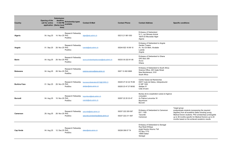Country Submission Opening of the deadline, Scholarship types call for online 11:59 PM available application (Swiss local time) Algeria 04. Aug 25 Research Fellowship 14. Nov 25 PhD PostDoc 01. Sep 25 Research Fellowship 28. Nov 25 PhD PostDoc 04. Aug 25 Research Fellowship 28. Nov 25 PhD PostDoc 04. Aug 25 Research Fellowship 28. Nov 25 PhD PostDoc 01. Sep 25 Angola Benin Botswana Burkina Faso Burundi Cameroon Cap Verde 04. Aug 25 29. Aug 25 04. Aug 25 Contact Phone Contact Address 00213 21 981 000 Embassy of Switzerland 9-11, rue Slimane Amirat 16070 El Mouradia/ Alger Algeria 00244 923 16 99 10 Embassy of Switzerland to Angola Garden Towers Av. Ho Chi Minh, Alvalade Luanda Angola 00233 30 222 81 85 Embassy of Switzerland to Ghana GPO Box 359 Accra Ghana [email protected] 0027 12 452 0695 Embassy of Switzerland to South Africa Science Office, 225 Veale Street New Muckleneuk, 0181 South Africa Research Fellowship 28. Nov 25 PhD PostDoc [email protected] 00225 27 22 44 79 89 [email protected] 00225 23 47 27 90/92 Research Fellowship 10. Nov 25 PhD PostDoc [email protected] Research Fellowship 28. Nov 25 PhD PostDoc Research Fellowship 12. Dez 25 PhD PostDoc Contact E-Mail [email protected] [email protected] [email protected] 00257 22 25 33 47 [email protected] [email protected] 00237 222 205 067 [email protected] 00237 222 211 857 [email protected] 00238 356 07 74 Specific conditions Centre Suisse de Recherches KM17 route de Dabou, Adiopodoumé 01 BP 1303 Abidjan 01 Côte d'Ivoire Bureau de la coopération suisse et Agence consulaire Av Patrice Lumumba 18 Bujumbura Burundi Embassy of Switzerland to Cameroon B.P. 1169 Yaoundé Cameroon Embassy of Switzerland to Senegal Rue René N'Diaye angle Seydou Nourou Tall PO Box 1772 15800 Dakar Senegal Target group: postgraduate students (possessing the required degrees) from all academic fields including young Medical Doctor students. PhD scholarships prolongable up to 36 months specific for Medical Doctors up to 24 months based on the achieved academic results. Country Central African Republic Chad Comoros Congo, Republic (Brazzaville) Congo, Democratic Republic (Kinshasa) Côte d'Ivoire Djibouti Egypt Submission Opening of the deadline, Scholarship types call for online 11:59 PM available application (Swiss local time) 29. Aug 25 04. Aug 25 04. Aug 25 04. Aug 25 Research Fellowship 28. Nov 25 PhD PostDoc Research Fellowship 28. Nov 25 PhD PostDoc Research Fellowship 29. Nov 25 PhD PostDoc Research Fellowship 12. Dez 25 PhD PostDoc 04. Aug 25 Research Fellowship 12. Dez 25 PhD PostDoc 01. Sep 25 Research Fellowship 28. Nov 25 PhD PostDoc 04. Aug 25 Research Fellowship 14. Nov 25 PhD PostDoc 04. Aug 25 Research Fellowship 10. Nov 25 PhD PostDoc Contact E-Mail Contact Phone [email protected] 00237 222 205 067 [email protected] 00237 222 211 857 Contact Address Embassy of Switzerland to Cameroon B.P. 1169 Yaoundé Cameroon 00235 22 51 73 14 Bureau de la coopération suisse et Agence consulaire Quartier Sabangali, B.P. 1102 N'Djamena Chad 00261 20 22 629 97/98 Embassy of Switzerland to Madagascar Immeuble "ARO" - 2e étage, B.P. 118 Làlana Solombavambahoaka Frantsay 77 Antsahavola 101 Antananarivo Madagascar 00243 89 89 46 800/01 Embassy of Switzerland to Democratic Republic of the Congo 654, Blvd Colonel Tshatshi Commune de Gombe Kinshasa Democratic Republic of Congo [email protected] 00243 89 89 46 800/01 Embassy of Switzerland to Democratic Republic of the Congo 654, Blvd Colonel Tshatshi Commune de Gombe Kinshasa Democratic Republic of Congo [email protected] 00225 27 22 44 79 89 [email protected] 00225 23 47 27 90/92 [email protected] [email protected] [email protected] [email protected] [email protected] Centre Suisse de Recherches KM17 route de Dabou, Adiopodoumé 01 BP 1303 Abidjan 01 Côte d'Ivoire 00251 11 371 11 07 Embassy of Switzerland to Ethiopia P.O. Box 1106, Old Airport Kolfe Keranyo, Woreda 09 Addis Ababa Ethiopia 00202 2575 82 84 Embassy of Switzerland 10, Abdel Khalek Sarwat Street 11511 Cairo Egypt Specific conditions Country Equatorial Guinea Eritrea Eswatini Ethiopia Gabon Gambia Ghana Guinea Submission Opening of the deadline, Scholarship types call for online 11:59 PM available application (Swiss local time) 29. Aug 25 Research Fellowship 28. Nov 25 PhD PostDoc 04. Aug 25 Research Fellowship 28. Nov 25 PhD PostDoc 04. Aug 25 Research Fellowship 28. Nov 25 PhD PostDoc 04. Aug 25 04. Aug 25 Research Fellowship 14. Nov 25 PhD PostDoc Research Fellowship 12. Dez 25 PhD PostDoc 04. Aug 25 Research Fellowship 12. Dez 25 PhD PostDoc 04. Aug 25 Research Fellowship 28. Nov 25 PhD PostDoc 01. Sep 25 Research Fellowship 28. Nov 25 PhD PostDoc Contact E-Mail Contact Phone [email protected] 00237 222 205 067 [email protected] 00237 222 211 857 Contact Address Embassy of Switzerland to Cameroon B.P. 1169 Yaoundé Cameroon 00254 730 694 000 Embassy of Switzerland to Kenya P.O. Box 2600 00621 Nairobi Kenya 0027 12 452 0695 Embassy of Switzerland to South Africa Science Office, 225 Veale Street New Muckleneuk, 0181 South Africa 00251 11 371 11 07 Embassy of Switzerland to Ethiopia P.O. Box 1106, Old Airport Kolfe Keranyo, Woreda 09 Addis Ababa Ethiopia 00243 89 89 46 800 Embassy of Switzerland to Democratic Republic of the Congo 654, Blvd Colonel Tshatshi Commune de Gombe Kinshasa Democratic Republic of Congo 00220 446 08 36 Embassy of Switzerland to Senegal Rue René N'Diaye angle Seydou Nourou Tall PO Box 1772 15800 Dakar Senegal [email protected] 00233 30 222 81 85 Embassy of Switzerland to Ghana GPO Box 359 Accra Ghana [email protected] 00225 23 47 27 90/92 [email protected] 00225 27 22 44 79 89 [email protected] [email protected] [email protected] [email protected] [email protected] Centre Suisse de Recherches KM17 route de Dabou, Adiopodoumé 01 BP 1303 Abidjan 01 Côte d'Ivoire Specific conditions Country Guinea-Bissau Kenya Lesotho Liberia Libya Madagascar Malawi Mali Submission Opening of the deadline, Scholarship types call for onl