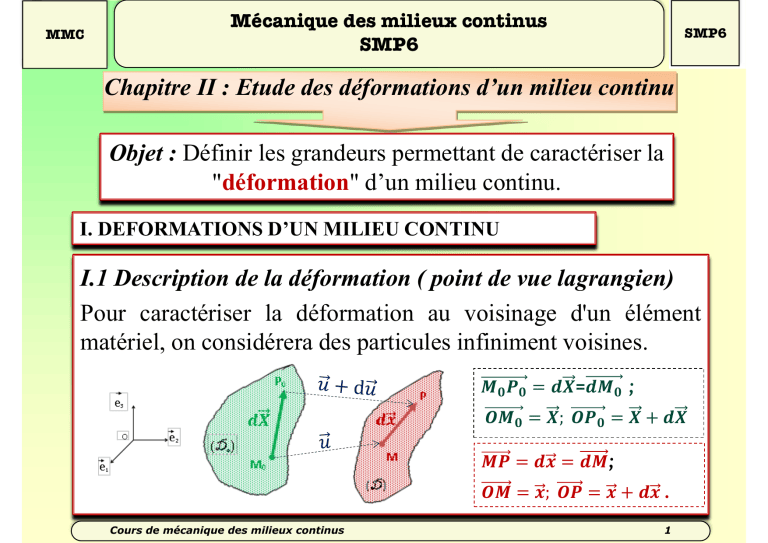 I. DEFORMATIONS D UN MILIEU CONTINU
