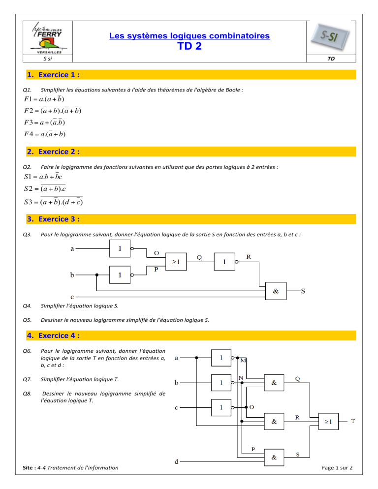Les systèmes logiques combinatoires TD 2 S si TD 1. Exercice 1 : Q1. Simplifier les équations suivantes à l'aide des théorèmes de l'algèbre de Boole : F1 = a.(a + b) F2 = (a + b).(a + b) F3 = a + (a.b) F4 = a.(a + b) 2. Exercice 2 : Q2. Faire le logigramme des fonctions suivantes en utilisant que des portes logiques à 2 entrées : S1 = a.b + bc S 2 = (a + b).c S 3 = (a + b).(d + c) 3. Exercice 3 : Q3. Pour le logigramme suivant, donner l’équation logique de la sortie S en fonction des entrées a, b et c : Q4. Simplifier l’équation logique S. Q5. Dessiner le nouveau logigramme simplifié de l’équation logique S. 4. Exercice 4 : Q6. Pour le logigramme suivant, donner l’équation logique de la sortie T en fonction des entrées a, b, c et d : Q7. Simplifier l’équation logique T. Q8. Dessiner le nouveau logigramme simplifié de l’équation logique T. Site : 4-4 Traitement de l’information Page 1 sur 2 S si Logique combinatoire - TD2 TD 5. Exercice 5 : Q9. A partir de la table de vérité ci-contre, déterminer l’équation logique S : Q10. Simplifier l’équation logique S. Q11. Compléter les chronogrammes ci-dessous. A B C S 0 0 0 0 1 1 1 1 0 0 1 1 0 0 1 1 0 1 0 1 0 1 0 1 1 1 1 0 0 0 1 0 6. Exercice 6 : Accès à un parking de stationnement : Un parking souterrain est géré grâce à un gardien et à partir de capteurs de détection de véhicules. Un capteur p dans le sol détectera la présence d'un véhicule à l'entrée du parking (p = "1"). Un capteur h en hauteur détectera la présence d'un véhicule de plus de 2 mètres (h = "1"). Pour une hauteur supérieure à 2 mètres l'entrée dans le parking est interdite. De plus le gardien du parking aura la possibilité de fermer un contact g ( g = "1") si le parking est plein, pour ne pas autoriser l'entrée de véhicules supplémentaires. L'autorisation de pénétrer sera visualisée sur un feu bicolore : • Si le feu est vert la barrière s'ouvrira et le véhicule pourra pénétrer dans le parking. • Si le feu est rouge la barrière restera fermée. Q12. Donnez la table de vérité du système. Pour les combinaisons matériellement impossibles, le feu rouge restera allumé. Q13. En déduire les équations Logiques de "Vert" et "Rouge". Q14. Réalisez le schéma à l’aide de portes logiques Site : 4-4 Traitement de l’information Page 2 sur 2