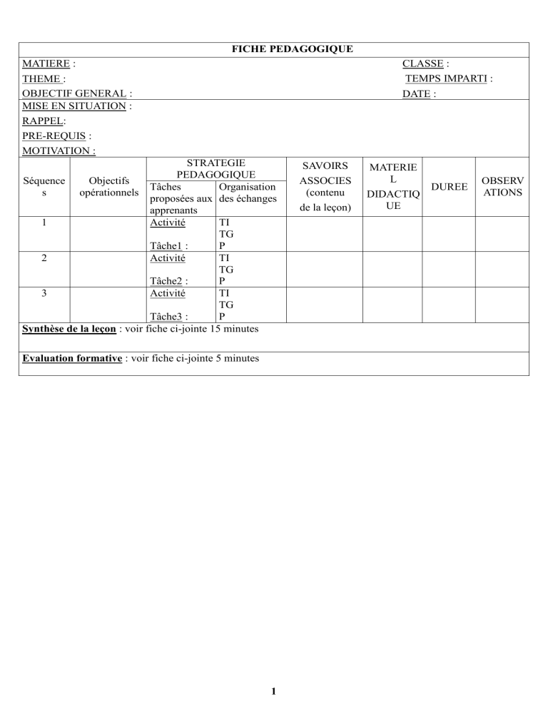 FICHE PEDAGOGIQUE MATIERE : CLASSE : TEMPS IMPARTI : DATE : THEME : OBJECTIF GENERAL : MISE EN SITUATION : RAPPEL: PRE-REQUIS : MOTIVATION : STRATEGIE PEDAGOGIQUE Séquence Objectifs Tâches Organisation s opérationnels proposées aux des échanges apprenants 1 Activité TI TG Tâche1 : P 2 Activité TI TG Tâche2 : P 3 Activité TI TG Tâche3 : P Synthèse de la leçon : voir fiche ci-jointe 15 minutes Evaluation formative : voir fiche ci-jointe 5 minutes 1 SAVOIRS ASSOCIES (contenu de la leçon) MATERIE L DIDACTIQ UE DUREE OBSERV ATIONS FICHE) SYNTHESE DE LA LECON N° 1. 2. 3. 2 FICHE D’EVALUATION FORMATIVE 1. 2. 3. 3 DOCUMENT -ELEVE N° Activité : Objectif pédagogique : identifier les éléments constitutifs d’un circuit d’alimentation en carburant avec carburateur Consigne : lisez attentivement le texte ci-dessous et le support pour exécuter les tâches qui suivent. Texte : L’automobile repose sur plusieurs systèmes essentiels qui garantissent son fonctionnement, sa sécurité et son confort. Parmi ces systèmes, nous avons le système d’alimentation en carburant. Ce dernier permet d’assurer le mélange air-carburant et son acheminement vers le moteur pour la combustion. En effet, la carburation est l’ensemble des opérations grâce auxquelles on obtient le mélange air plus combustible qui sera admis dans les cylindres. Quelques sont à remplir, à savoir : Le dosage : proportionner convenablement le combustible et l’air pour obtenir la combustion rapide et complète du mélange. L’homogénéité : c’est le problème de réaliser le même dosage dans toute la masse L’automaticité : c’est le problème d’assurer le dosage convenable à tous les régimes du moteur possibles sans intervention extérieure. L’égalité : c’est le problème de répartir le mélange carburé également entre tous les cylindres du moteur. De plus, la carburation est réalisée presque totalement dans le carburateur où arrivent l’essence envoyée par la pompe d’alimentation et l’air atmosphérique par la pression que crée la descente du piston lors du temps d’admission. Le combustible entrainé par le courant d’air se divise en fines gouttelettes, qui sont-elles mêmes pulvérisées par le choc contre l’air. Ceci favorise la vaporisation du combustible et prépare ainsi la formation d’un mélange homogène. Source : inédit 4 Tâche : Exploite le texte et le support ainsi que vos connaissances antérieures pour répondre aux questions suivantes. 1- Définissez la carburation. 2- Donnez et expliquez les conditions à remplir. 3- Décrivez la réalisation de la carburation et le dosage d’un mélange. 4- Citez les trois grandes parties d’un système d’alimentation en essence puis donnez le rôle du réservoir à l’aide de la figure N°1. 5- Donnez les différents types de pompe et leurs rôles. 6- a- Donnez le rôle d’un carburateur. b- Décrivez un carburateur et son fonctionnement à l’aide de la figure N°2. Stratégie de travail Travail individuel : 30min Travail de groupe : 30min Plénière : 45min 5