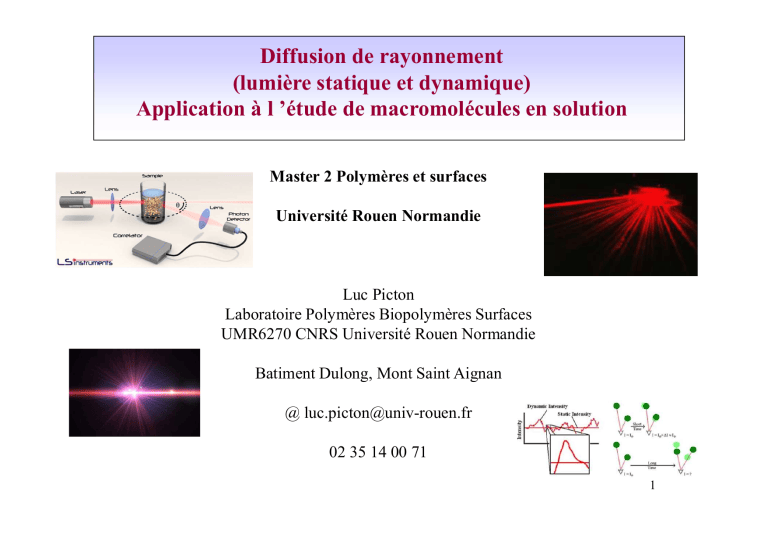 Diffusion de rayonnement (lumière statique et dynamique) Application à l ’étude de macromolécules en solution Master 2 Polymères et surfaces Université Rouen Normandie Luc Picton Laboratoire Polymères Biopolymères Surfaces UMR6270 CNRS Université Rouen Normandie Batiment Dulong, Mont Saint Aignan @ [email protected] 02 35 14 00 71 1 Diffusion de rayonnement (lumière statique et dynamique) Application à l ’étude de macromolécules en solution Que nous apportent les expériences de diffusion de rayonnement? Propriétés statiques Propriétés dynamiques Occupation de l’espace Masse molaire rayons de giration conformation, structure interactions Mouvements des molécules Coefficient de diffusion rayons hydrodynamiques 2 Les techniques de diffusion de rayonnement sont basées sur les interactions électromagnétiques - matière l l 3 cas à envisager : • Pas d’interaction : transmission • Absorption d ’énergie chaleur, réaction chimique, ré émission (fluorescence, phosphorescence) • Diffusion élastique à la même l dans toutes les directions de l ’espace Impossible de décrire le mouvement de chaque particule par la mécanique classique. Le mouvement d’une particule donnée est imprévisible. D’un point de vue macroscopique, les propriétés peuvent être décrites par des lois statistiques 3 Intérêt de la diffusion l q L’intensité diffusée dépend • de l et de q • de la taille et de la structure des particules diffusantes La diffusion statique de la lumière (static light scattering SLS) moyenne dans le temps l ’intensité diffusée sur toutes les conformations possibles et les mouvements de fluctuations Multi Angle Laser Light Scattering (MALLS) En faisant varier l’angle et la concentration on peut alors accéder • à la masse molaire moyenne en poids • au facteur de forme • aux rayons de giration (dans certains cas) • au paramètre thermodynamique de solvatation 4 . Diffusion dynamique de la lumière (dynamic light scattering DLS) Quasi-Elastic Light Scattering (QELS) Photon Correlation Spectroscopie (PCS) Les fluctuations de l’intensité diffusée dues aux mouvements locaux (mouvements Browniens) de particules diffusantes dans le temps peuvent être corrélées à courtes distances (ou sur des temps courts). La fonction d ’auto-corrélation de ces fluctuations temporelles de l’intensité diffusée peut alors être reliée au • Coefficient de diffusion, • lui même relié au rayon hydrodynamique (Rh). Remarque : les techniques de diffusion de rayonnement sont différentes selon les sources de rayonnement : lumière (polarisabilité des molécules), RX (nuages électroniques), neutrons.. Mais elles répondent toutes aux mêmes formalismes 5 Diffusion Statique de la Lumière I- Propriétés et principes Si on considère une onde plane monochromatique de longueur d’onde l. L’équation de propagation s ’écrit : 2p k0 u0 l x , t 0 .e i ( t k 0 x ) k0=2p/l la norme du vecteur d ’onde =2pc/l la pulsation Cette onde peut être vue comme un ensemble de particules (faisceau de photons ou de neutrons) se déplaçant à la même vitesse et dans des directions parallèles. Quand cette onde interagit avec un centre diffusant quelconque, elle est diffusée dans toutes les directions de l’espace. L’onde diffusée est sphérique. L’hypothèse de diffusion élastique suppose que les particules ne perdent pas d ’énergie lorsqu ’elles sont diffusées 6 I-1 longueur de diffusion (b) pour un centre diffusant 2p k0 u0 l Centre diffusant D D : distance échantillon-détecteur Détecteur de surface s Remarque : l’onde diffuse avec une symétrie sphérique et la diffusion est élastique (même l) La probabilité que les photons soient réémis dépend de la surface des particules diffusantes : on définit alors la section efficace de diffusion (surface de la particule diffusante « vue » par le rayonnement) s= (nombres de particules diffusées)/(nombre de particules incidentes : flux) Idiff s 4pb 2 b : longueur de diffusion, intrinsèque à la particule diffusante (interaction de rayonnement) 7 Intensité sur le détecteur Si l’intensité totale diffusée dans toutes les directions est indépendante de D par contre l’intensité recueillie par le détecteur D est proportionnelle au rapport des aires () I détecteur Idiffusée . , l’angle solide s la surface du détecteur D la distance échantillon-détecteur s 4pD 2 Idétecteur Idiffusée . s 4pD 2 .( b2 b 2 D s O ) b 2 I détecteur .s.( ) D I 1 Idiffusée . s diff 4pb 2 2 4pb On peut alors exprimer la fonction d ’onde par rapport à l’angle solide, donc par rapport à D b i ( t kD ) D, t 0 .( ).e D 8 Longueur de diffusion en fonction du rayonnement Lumière : b=(k0.n)2.a avec b>0, n : indice de réfraction et a : polarisabilité RX : b=Z.re avec Z : numéro atomique, re = 0,282.10-12cm (rayon de l ’e-) Neutrons b lié aux interactions nucléaires expérimental (> ou < 0) 9 I-2 Diffusion pour un ensemble de centres diffusants Chaque particule va diffuser la lumière mais tous ces rayonnements émis vont interférer entre eux q Ces interférences vont permettrent de déterminer la structure du composé diffusant Si N particules diffusent i= (1, 2, …..N) l’onde diffusée par la particule 1, au point O est : b 1 0 .( 1 ).e i ( t kD ) D l’onde diffusée par la particule i au point M est : Il apparaît une différence de phase entre ces 2 ondes de déphasage : i b i 0 .( i ).e i ( t kD i ) D 10 Vecteur de diffusion ou fonction d ’onde : q Les ondes diffusées par différentes particules vont interférer. Pour calculer ces interférences, il faut calculer les différences de marche des ondes diffusées dans une direction donnée définie par exemple par un vecteur unitaire u1 M u0 O M O Différence de marche : x i ri .u 0 ri .u1 ri .(u 0 u1 ) Différence de phase r .( k k ) r i i 0 1 i .q des ondes diffusées k1 k0 k1 k 0 k1 q q/2 q 2 sin(q 2) k q 4p q sin( 