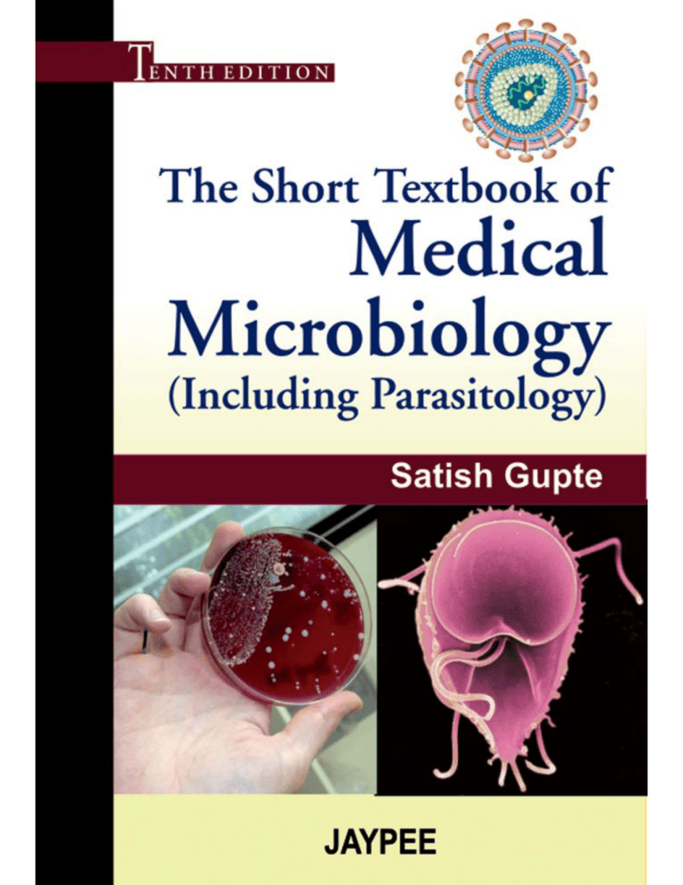 The Short Textbook of Medical Microbiology (Including Parasitology) The Short Textbook of Medical Microbiology (Including Parasitology) Tenth Edition Satish Gupte MD Professor and Head Department of Microbiology Gian Sagar Medical College and Hospital Ramnagar (Banur), Distt. Patiala. (Punjab) Ex-Professor and Head Department of Microbiology Adesh Institute of Medical Sciences and Research Centre Bathinda (Punjab) and Govt. Medical College and Associated Hospitals Jammu 180001, J & K, India ® JAYPEE BROTHERS MEDICAL PUBLISHERS (P) LTD New Delhi • St Louis (USA) • Panama City (Panama) • Ahmedabad • Bengaluru Chennai • Hyderabad • Kochi • Kolkata • Lucknow • Mumbai • Nagpur Published by Jitendar P Vij Jaypee Brothers Medical Publishers (P) Ltd Corporate Office 4838/24 Ansari Road, Daryaganj, New Delhi - 110002, India, Phone: +91-11-43574357 Fax: +91-11-43574314 Registered Office B-3 EMCA House, 23/23B Ansari Road, Daryaganj, New Delhi - 110 002, India Phones: +91-11-23272143, +91-11-23272703, +91-11-23282021 +91-11-23245672, Rel: +91-11-32558559, Fax: +91-11-23276490, +91-11-23245683 e-mail: [email protected], Website: www.jaypeebrothers.com Offices in India Ahmedabad, Phone: Rel: +91-79-32988717, e-mail: [email protected] Bengaluru, Phone: Rel: +91-80-32714073, e-mail: [email protected] Chennai, Phone: Rel: +91-44-32972089, e-mail: [email protected] Hyderabad, Phone: Rel:+91-40-32940929, e-mail: [email protected] Kochi, Phone: +91-484-2395740, e-mail: [email protected] Kolkata, Phone: +91-33-22276415, e-mail: [email protected] Lucknow, Phone: +91-522-3040554, e-mail: [email protected] Mumbai, Phone: Rel: +91-22-32926896, e-mail: [email protected] Nagpur, Phone: Rel: +91-712-3245220, e-mail: [email protected] Overseas Offices North America Office, USA, Ph: 001-636-6279734, e-mail: [email protected], [email protected] Central America Office, Panama City, Panama, Ph: 001-507-317-0160 e-mail: [email protected] Website: www.jphmedical.com The Short Textbook of Medical Microbiology (Including Parasitology) © 2010, Mrs Jyotsna Gupte All rights reserved. No part of this publication should be reproduced, stored in a retrieval system, or transmitted in any form or by any means: electronic, mechanical, photocopying, recording, or otherwise, without the prior written permission of the author and the publisher. This book has been published in good faith that the material provided by author is original. Every effort is made to ensure accuracy of material, but the publisher, printer and author will not be held responsible for any inadvertent error(s). In case of any dispute, all legal matters are to be settled under Delhi jurisdiction only. First Edition : 1982 Second Edition: 1984 Third Edition: 1986 Fourth Edition: 1989 Fifth Edition: 1993 Indonesian Edition: 1990 Sixth Edition: 1995 Seventh Edition: 1999 Eighth Edition: 2002 Ninth Edition: 2006 Tenth Edition : 2010 ISBN : 978-81-8448-840-1 Typeset at : JPBMP typesetting unit Printed at : GIAN SAGAR MEDICAL COLLEGE & HOSPITAL Ram Nagar (Banur), Distt. Patiala, Punjab-140601 (India) Mobile : 9876900006, Telefax : 01762-507759 Foreword Dr Satish Gupte has done wonderful job in updating his book to tenth edition. The simplicity of language and scholarly work done in the book shows the effort of author for updating the book. I wish more undergraduate and postgraduate students will read this book for updating their knowledge and skills. I wish the book to be a landmark in subject of Microbiology. Dr AS Sekhon MD Principal Gian Sagar Medical College and Hospital Ram Nagar (Banur) Distt. Patiala, Punjab India Preface to the Tenth Edition Over 27 years back first edition of The Short Textbook of Medical Microbiology was brought out in 1982. Since then the volume is galloping while passing through silver jubilee year landing right into revised, enlarged and updated tenth edition decorated elegantly and colorfully with entirely fresh and new get up. Indonesian edition of this volume was published in 1990 with collaboration of Binarupa Aksara under the title MICROBIOLOGI DASAR earning fame and name in that region. It has been kept in mind to condense and include the latest major meaningful advances in medical microbiology in this volume. Distinct feature of this volume is inclusion of updated Medical Parasitology with Entomology. All the chapters are thoroughly revised and updated as highlighted by esteemed readers from time to time. New chapters are included namely; microbiology in the service of human being, molecular techniques in microbiology, emerging and re-emerging infections and laboratory and hospital wastes. Also included in this volume: Biofilm, new methods of disinfection and sterilization, super antigen, Ogawa medium, adenosine deaminase activity, immunological investigations of Mycobacterium tuberculosis, Napah virus, pandemic of swine flu (H1N1) breakthrough 2009, laboratory diagnosis of septicemia/bacteremia and infective endocarditis and Nobel prize in Medicine etc. The challenge was to keep the volume comprehensive, profusely colored, beautifully illustrated and still handy maintaining emphasis on the needs of MBBS and BDS students. Several colored figures and photographs, tables and colored illustrations (adjusted appropriately between texts) are included to enhance and intensify the utility of this volume. The chapters pertaining to clinical microbiology are especially addressed to budding doctors (interns and house surgeons/physicians) who usually face problems in collection and transportation of clinical samples for laboratory investigations. It is the privilege to offer my sincere gratitude to my respected teachers: Professor TD Chugh, Professor Uma Sabharwal, Professor RK Arya and Professor DR Arora for their blessings, encouragement, inspiration and good will. My special thanks to Professor Aruna Aggarwal, Professor BL Sherwal, Professor Jagdish Chander, Professor Prem Narwan, Professor Raj Kumar, Professor Anjum, P