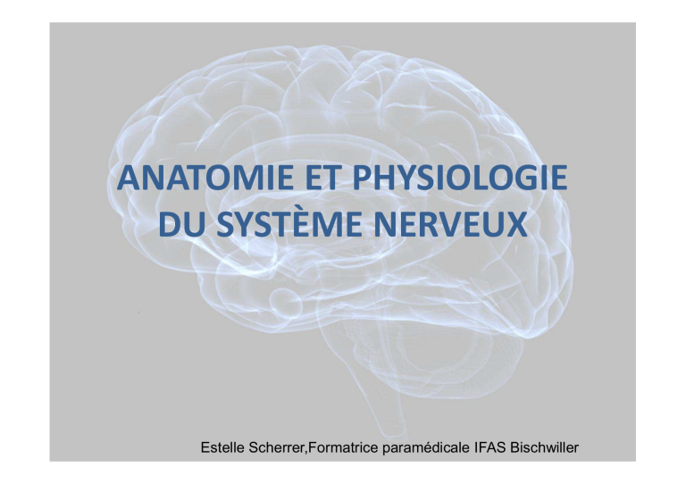 ANATOMIE ET PHYSIOLOGIE DU SYSTÈME NERVEUX , Estelle Scherrer,Formatrice paramédicale IFAS Bischwiller PREAMBULE • Les parties du cours en caractères bleu, classées comme « BONUS » n’ont pas ou presque pas été abordés en cours. Elles sont données en complément mais ne seront pas soumises à évaluation PLAN 1. Organisation générale du système nerveux 1. Histologie et physiologie neuronale – Le neurone – le potentiel de repos et le potentiel d’action (bonus) pour expliquer le mécanisme membranaire de la transmission de l’influx (information) électrique – La synapse – Les cellules gliales (bonus) – La plaque motrice 2. Anatomie du système nerveux central – Méninges – Encéphale : cortex, cervelet, tronc cérébral – Moelle épinière 3. Le système nerveux périphérique 4. Le système nerveux autonome 5. Les explorations fonctionnelles en Neurologie Organisation générale du système nerveux -1Remarques: autonome c’est pareil que végétatif orthosympathique c’est pareil que sympathique Organisation générale du système nerveux -2Le système nerveux central comprend l’encéphale ainsi que la mœlle épinière. 1 L’encéphale correspond aux trois organes qui sont situés dans la cavité de la boîte crânienne qui sont le cerveau, le cervelet et le tronc cérébral. 2 La mœlle épinière est située dans le canal rachidien qui résulte de la superposition des vertèbres de la colonne vertébrale. Ces organes du système nerveux central sont des centres d’intégration qui analysent et interprètent les informations sensorielles afin de donner des commandes motrices basées sur l’expérience de l’individu, sur les réflexes ainsi que sur les conditions qui prévalent dans l’environnement externe. Le système nerveux périphérique est composé des organes du système nerveux situés à l’extérieur de la cavité crânienne et du canal rachidien donc à l’extérieur du système nerveux central. Ces organes correspondent aux différents nerfs rattachés à l’encéphale ou à la mœlle épinière. Les nerfs qui se rattachent au tronc cérébral de l’encéphale sont appelés des nerfs crâniens alors que ceux qui se rattachent à la mœlle épinière sont des nerfs rachidiens car ils émergent du canal rachidien. Organisation générale du système nerveux -3Encéphale Cerveau + cervelet + tronc cérébral = encéphale Encéphale + moelle épinière = système nerveux central Le neurone • Le neurone : cellule responsable de la genèse= (création), du traitement et de la propagation des informations. – Le neurone est une cellule communicante : chaque neurone reçoit des informations de 100000 neurones et envoie des informations vers 100000 neurones – Le neurone a une forme particulière : nombreux prolongements • 1 axone (qui se ramifie), de nombreux dendrites – Un neurone ne se divise pas – La substance grise est la zone où se trouvent les corps cellulaires – Substance blanche : prolongements Le neurone Corps cellulaire Dendrites Le neurone Le potentiel de repos du neurone bonus • Les neurones sont délimités par une membrane • La concentration en ions (notamment Na+, Cl-, K+) n’est pas la même de part et d’autre de la membrane • Cette différence de concentration va créer un potentiel de repos, c’est-à-dire une tension – Le potentiel de repos est de -70 mV • L’ouverture de canaux dans la membrane va permettre les échanges d’ions entre les deux côtés de la membrane, et donc modifier le potentiel : dépolarisation • Si la dépolarisation est suffisamment importante, création d’un potentiel d’action : vague de dépolarisation qui se propage Naissance de l’influx électrique bonus Extra-cellulaire -++---+++---+--++++-------++-----+------+-----++--Membrane Potentiel -70 mV -++++++-+-++++-++---++++--++++++-+++-++-+-+++ Intra-cellulaire ions Extra-cellulaire + + + + + - + + + - + + + + + - + + - - + + + + - - + - + - + + + - + - + + - + - + + - - + - + - + + Potentiel Membrane - - -30 mV -+--- ++-+-+---+++-++---+--+-----+-+----+--+++----+ Ouverture de canaux Intra-cellulaire - Création d’un potentiel d’action L’information dans le système nerveux • L’information dans le système Nerveux est codée par des signaux électriques : potentiels d’action répétés • Ces signaux cheminent le long des prolongements des neurones comme du courant dans des fils électriques (cf illustration page suivante) • La propagation du signal électrique est favorisée et accélérée par la myéline, substance qui recouvre les axones • Entre 2 neurones (synapse), le courant est transformé en signal chimique (les neurotransmetteurs) Propagation du signal électrique Gaine myéline - La synapse • La synapse c’est la zone d’échange d’information entre deux neurones – Les deux neurones ne se touchent pas : il existe un espace entre les 2 (fente synaptique) – L’arrivée du signal électrique provoque la libération dans la fente synaptique de substances chimiques appelées neurotransmetteurs • Ex : acétylcholine, dopamine, GABA, sérotonine… – Ces neurotransmetteurs se fixent sur le neurone post-synaptique et provoquent la création d’un signal électrique en déclenchant l’ouverture de canaux et donc la dépolarisation membranaire La synapse A : Neurone pré-synaptique (axone) Libération du neurotransmetteur Récepteur B : Neurone post-synaptique (dendrite) Les cellules gliales bonus • 10 x plus nombreuses que les neurones • Ces cellules environnent les neurones, et assurent de multiples fonctions : – Immunitaire – Synthèse de la myéline – « étanchéité » de la synapse… • On en distingue plusieurs types : astrocyte, oligodendrocyte, cellule de Schwann, microglie… • Tumeurs cérébrales : souvent au dépens de ces cellules La plaque motrice • La contraction des muscles est déclenchée par l’arrivée d’un signal électrique condui