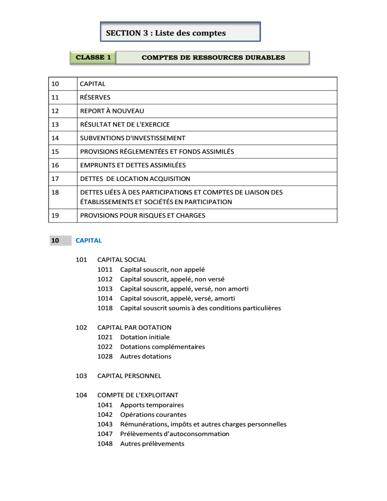 SECTION 3 : Liste des comptes CLASSE 1 COMPTES DE RESSOURCES DURABLES 10 CAPITAL 11 RÉSERVES 12 REPORT À NOUVEAU 13 RÉSULTAT NET DE L'EXERCICE L'EXERCICE 14 SUBVENTIONS D'INVESTISSEMENT 15 PROVISIONS RÉGLEMENTÉES RÉGLEMENTÉES ET FONDS ASSIMILÉS 16 EMPRUNTS ET DETTES ASSIMILÉES 17 DETTES DE LOCATION ACQUISITION ACQUISITION 18 DETTES LIÉES À DES PARTICIPATIONS PARTICIPATIONS ET COMPTES DE LIAISON DES ÉTABLISSEMENTS ÉTABLISSEMENTS ET SOCIÉTÉS EN PARTICIPATION 19 PROVISIONS POUR RISQUES ET CHARGES 10 CAPITAL 101 CAPITAL SOCIAL 1011 Capital souscrit, non appelé 1012 Capital souscrit, appelé, non versé 1013 Capital souscrit, appelé, versé, non amorti 1014 Capital souscrit, appelé, versé, amorti 1018 Capital souscrit soumis à des conditions particulières 102 CAPITAL PAR DOTATION 1021 Dotation initiale 1022 Dotations complémentaires complémentaires 1028 Autres dotations 103 CAPITAL PERSONNEL 104 COMPTE DE L'EXPLOITANT L'EXPLOITANT 1041 Apports temporaires 1042 Opérations courantes 1043 Rémunérations, impôts et autres charges personnelles 1047 Prélèvements d’autoconsommation d’autoconsommation 1048 Autres prélèvements 11 12 105 PRIMES LIÉES AU CAPITAL SOCIAL 1051 Primes d'émission 1052 Primes d'apport 1053 Primes de fusion 1054 Primes de conversion 1058 Autres primes 106 ÉCARTS DE RÉÉVALUATION RÉÉVALUATION 1061 Écarts de réévaluation légale 1062 Écarts de réévaluation libre 109 APPORTEURS, CAPITAL SOUSCRIT, NON APPELÉ RÉSERVES 111 RÉSERVE LÉGALE 112 RÉSERVES STATUTAIRES STATUTAIRES OU CONTRACTUELLES CONTRACTUELLES 113 RÉSERVES RÉGLEMENTÉES RÉGLEMENTÉES 1131 Réserves de plus-values nettes à long terme 1132 Réserves d’attribution gratuite d’actions au personnel salarié et aux dirigeants 1133 Réserves consécutives à l'octroi de subventions d'investissement d'investissement 1134 Réserves des valeurs mobilières donnant accès au capital 1138 Autres réserves réglementées réglementées 118 AUTRES RÉSERVES 1181 Réserves facultatives 1188 Réserves diverses REPORT A NOUVEAU 121 REPORT À NOUVEAU CRÉDITEUR 129 REPORT À NOUVEAU DÉBITEUR 1291 Perte nette à reporter 1292 Perte - Amortissements réputés différés 13 14 RÉSULTAT NET DE L'EXERCICE 130 RÉSULTAT EN INSANCE D’AFFECTATION 1301 Résultat en instance d'affectation : Bénéfice 1309 Résultat en instance d'affectation : Perte 131 RÉSULTAT NET : BÉNÉFICE 132 MARGE COMMERCIALE (MC) 133 VALEUR AJOUTÉE (V.A.) 134 EXCÉDENT BRUT D'EXPLOITATION D'EXPLOITATION (E.B.E.) 135 RÉSULTAT D'EXPLOITATION D'EXPLOITATION (R.E.) 136 RÉSULTAT FINANCIER (R.F.) 137 RÉSULTAT DES ACTIVITÉS ORDINAIRES (R.A.O.) 138 RÉSULTAT HORS ACTIVITÉS ORDINAIRES (R.H.A.O.) 1381 Résultat de fusion 1382 Résultat d’apport d’apport partiel partiel d’actif 1383 Résultat de scission 1384 Résultat de liquidation 139 RÉSULTAT NET : PERTE SUBVENTIONS D'INVESTISSEMENT 141 SUBVENTIONS D'EQUIPEMENT 1411 État 1412 Régions 1413 Départements 1414 Communes et collectivités collectivités publiques décentralisées décentralisées 1415 1416 1417 1418 148 15 16 Entités publiques ou mixtes Entités et organismes privés Organismes internationaux Autres AUTRES SUBVENTIONS D'INVESTISSEMENT PROVISIONS RÉGLEMENTÉES ET FONDS ASSIMILÉS 151 AMORTISSEMENTS DÉROGATOIRES DÉROGATOIRES 152 PLUS-VALUES DE CESSION À RÉINVESTIR 153 FONDS RÉGLEMENTÉS RÉGLEMENTÉS 1531 Fonds National 1532 Prélèvement pour le Budget 154 PROVISIONS SPÉCIALES DE RÉÉVALUATION RÉÉVALUATION 155 PROVISIONS RÉGLEMENTÉES RÉGLEMENTÉES RELATIVES AUX IMMOBILISATIONS IMMOBILISATIONS 1551 Reconstitution des gisements miniers et pétroliers 156 PROVISIONS RÉGLEMENTÉES RÉGLEMENTÉES RELATIVES AUX STOCKS 1561 Hausse de prix 1562 Fluctuation des cours 157 PROVISIONS POUR INVESTISSEMENT 158 AUTRES PROVISIONS ET FONDS RÉGLEMENTES RÉGLEMENTES EMPRUNTS ET DETTES ASSIMILÉES 161 EMPRUNTS OBLIGATAIRES OBLIGATAIRES 1611 Emprunts obligataires ordinaires 1612 Emprunts obligataires convertibles en actions 1613 Emprunts obligataires remboursables en actions 1618 Autres emprunts obligataires 17 162 EMPRUNTS ET DETTES AUPRÈS DES ÉTABLISSEMENTS ÉTABLISSEMENTS DE CRÉDIT 163 AVANCES REÇUES DE L'ÉTAT 164 AVANCES REÇUES ET COMPTES COURANTS BLOQUÉS BLOQUÉS 165 DÉPÔTS ET CAUTIONNEMENTS CAUTIONNEMENTS RECUS 1651 Dépôts 1652 Cautionnements 166 INTÉRÊTS COURUS 1661 sur emprunts obligataires 1662 sur emprunts et dettes auprès des établissements établissements de crédit crédit 1663 sur avances reçues de l'État 1664 sur avances reçues et comptes courants bloqués 1665 sur dépôts et cautionnements reçus 1667 sur avances assorties de conditions particulières 1668 sur autres emprunts et dettes 167 AVANCES ASSORTIES DE CONDITIONS PARTICULIÈRES PARTICULIÈRES 1671 Avances bloquées pour augmentation du capital 1672 Avances conditionnées par l'État 1673 Avances conditionnées par les autres organismes africains 1674 Avances conditionnées par les organismes internationaux 168 AUTRES EMPRUNTS ET DETTES 1681 Rentes viagères capitalisées 1682 Billets de fonds 1683 Dettes consécutives à des titres empruntés 1684 Emprunts participatifs 1685 Participation des travailleurs aux bénéfices 1686 Emprunts et dettes contractés auprès des autres tiers DETTES DE LOCATION ACQUISITION 172 DETTES DE LOCATION ACQUISITION/ ACQUISITION/ CRÉDIT-BAIL IMMOBILIER 173 DETTES DE LOCATION ACQUISITION/ ACQUISITION/ CRÉDIT-BAIL MOBILIER 174 DETTES DE LOCATION ACQUISITION /LOCATION DE VENTE 18 19 176 INTÉRÊTS COURUS 1762 sur dettes de location acquisition / crédit-bail immobilier 1763 dettes de location acquisition /crédit-bail mobilier 1764 sur dettes de location acquisition acquisition /location-vente 1768 sur autres dettes de location acquisition 178 AUTRES DETTES DE LOCATION LOCATION ACQUISITION DETTES LIÉES À DES PARTICIPATIONS ET COMPTES DE LIAISON DES ÉTABLISSEMENTS ET SOCIÉTÉS EN PARTICIPATION 181 DETTES LIÉES À DES PART