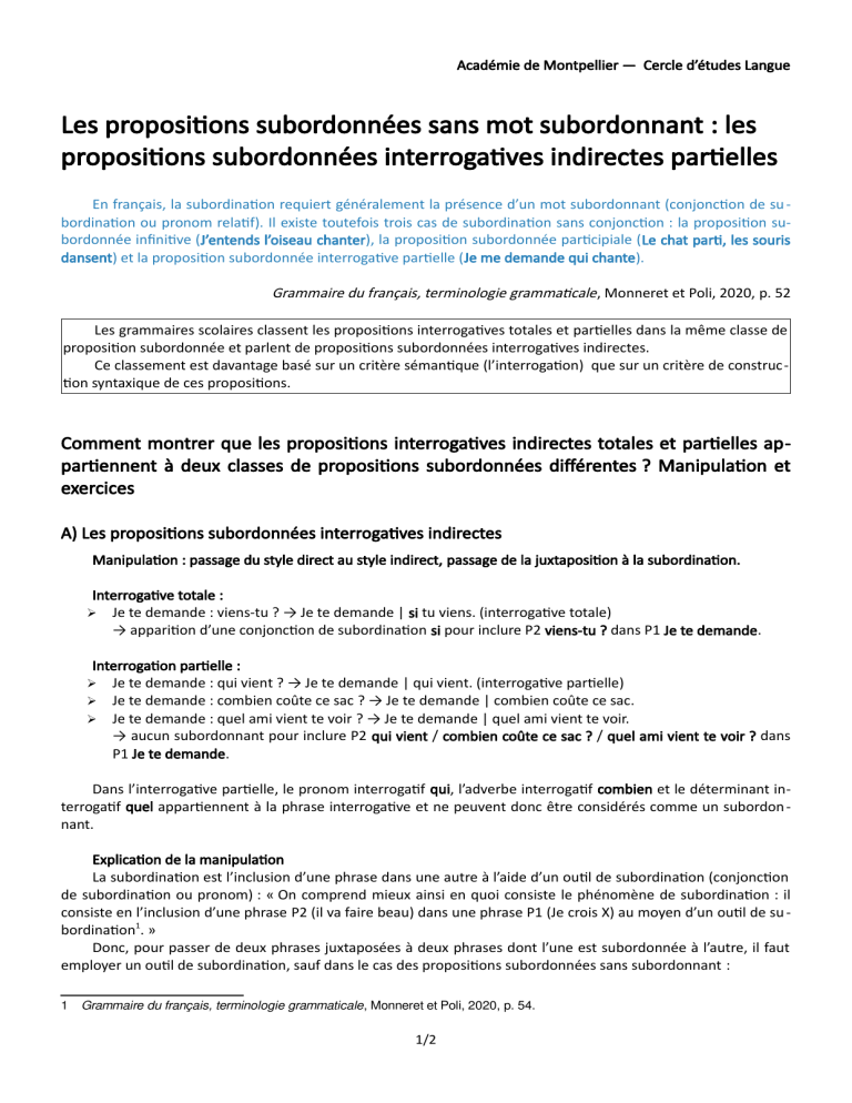 Académie de Montpellier — Cercle d’études Langue Les propositions subordonnées sans mot subordonnant : les propositions subordonnées interrogatives indirectes partielles En français, la subordination requiert généralement la présence d’un mot subordonnant (conjonction de su bordination ou pronom relatif). Il existe toutefois trois cas de subordination sans conjonction : la proposition subordonnée infinitive (J’entends l’oiseau chanter), la proposition subordonnée participiale (Le chat parti, les souris dansent) et la proposition subordonnée interrogative partielle (Je me demande qui chante). Grammaire du français, terminologie grammaticale, Monneret et Poli, 2020, p. 52 Les grammaires scolaires classent les propositions interrogatives totales et partielles dans la même classe de proposition subordonnée et parlent de propositions subordonnées interrogatives indirectes. Ce classement est davantage basé sur un critère sémantique (l’interrogation) que sur un critère de construction syntaxique de ces propositions. Comment montrer que les propositions interrogatives indirectes totales et partielles appartiennent à deux classes de propositions subordonnées différentes ? Manipulation et exercices A) Les propositions subordonnées interrogatives indirectes Manipulation : passage du style direct au style indirect, passage de la juxtaposition à la subordination. Interrogative totale : Je te demande : viens-tu ? → Je te demande | si tu viens. (interrogative totale) → apparition d’une conjonction de subordination si pour inclure P2 viens-tu ? dans P1 Je te demande. ➢ Interrogation partielle : ➢ Je te demande : qui vient ? → Je te demande | qui vient. (interrogative partielle) ➢ Je te demande : combien coûte ce sac ? → Je te demande | combien coûte ce sac. ➢ Je te demande : quel ami vient te voir ? → Je te demande | quel ami vient te voir. → aucun subordonnant pour inclure P2 qui vient / combien coûte ce sac ? / quel ami vient te voir ? dans P1 Je te demande. Dans l’interrogative partielle, le pronom interrogatif qui, l’adverbe interrogatif combien et le déterminant interrogatif quel appartiennent à la phrase interrogative et ne peuvent donc être considérés comme un subordon nant. Explication de la manipulation La subordination est l’inclusion d’une phrase dans une autre à l’aide d’un outil de subordination (conjonction de subordination ou pronom) : « On comprend mieux ainsi en quoi consiste le phénomène de subordination : il consiste en l’inclusion d’une phrase P2 (il va faire beau) dans une phrase P1 (Je crois X) au moyen d’un outil de su bordination1. » Donc, pour passer de deux phrases juxtaposées à deux phrases dont l’une est subordonnée à l’autre, il faut employer un outil de subordination, sauf dans le cas des propositions subordonnées sans subordonnant : 1 Grammaire du français, terminologie grammaticale, Monneret et Poli, 2020, p. 54. 1/2 Académie de Montpellier — Cercle d’études Langue La subordonnée interrogative totale peut être classée dans le type des propositions subordonnées complétives, car elle est incluse dans la phrase 1 par une conjonction de subordination : « dans les propositions subordonnées complétives, le mot subordonnant est une conjonction de subordination qui joue un rôle de pur outil grammatical2 ». ➢ La subordonnée interrogative partielle peut, elle, être classée dans le type des propositions subordonnées sans subordonnant, car elle est incluse dans la phrase 1 sans subordonnant. ➢ B) Les autres propositions sans mot subordonnant Manipulation : remplacement de la proposition subordonnée par une proposition subordonnée d’une autre classe ➢ Proposition subordonnée infinitive : ◦ J’entends l’oiseau chanter .→ J’entends que l’oiseau chante. ➢ Proposition subordonnée participiale : ◦ Le chat parti, les souris dansent. → Après que le chat est parti, les souris dansent. ◦ Les souris dansent, le chat parti. → Les souris dansent, après que le chat est parti. → Quand on remplace une proposition infinitive par une proposition complétive ou quand on remplace une proposition participiale par une proposition circonstancielle, on voit bien apparaître l’outil de subordination, qui est absent dans les infinitives ou les participiales. Apports théoriques Grammaire méthodique du français , 7e édition, Riegel, Pellat et Rioul, 2018 : « Les propositions subordonnées sont généralement introduites par des termes marquant leur dépendance par rapport à la principale : conjonctions de subordination, pronoms relatifs et mots interrogatifs. Mais il existe des subordonnées sans terme introducteur : subordonnées infinitives avec ou sans sujet réalisé, participiales et autres constructions absolues3. » On peut constater que les propositions subordonnées interrogatives indirectes partielles ne font pas partie ici des subordonnées sans terme introducteur. En revanche, plus loin, la Grammaire méthodique du français fait bien la différence entre les propositions subordonnées interrogatives indirectes totales et partielles en distinguant : ➢ « les subordonnées introduites par une conjonction de subordination qui n’a jamais de fonction à l’inté rieur de la subordonnée : […] la conjonction “si” est l’équivalent interrogatif de “que” : elle cumule le marquage de la subordination et l’indication du caractère interrogatif de la subordonnée. » ➢ « les subordonnées introduites par un terme interrogatif qui signalent le début de la proposition (Je me demande où est Pierre). Ces termes ne marquent pas spécifiquement le rapport de subordination, puisqu’ils introduisent également l’interrogation directe correspondante (Où est Pierre ?)4. » On retrouve donc bien ici les mêmes conclusions, même si la classification est différente et que les propositions subordonnées interrogatives indirectes par
