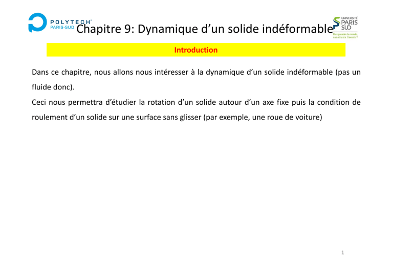 Chapitre 9: Dynamique d’un solide indéformable Introduction Dans ce chapitre, nous allons nous intéresser à la dynamique d’un solide indéformable (pas un fluide donc). Ceci nous permettra d’étudier la rotation d’un solide autour d’un axe fixe puis la condition de roulement d’un solide sur une surface sans glisser (par exemple, une roue de voiture) 1 Chapitre 9: Dynamique d’un solide indéformable I Eléments cinétiques d’un solide. II Solide en rotation autour d’un axe fixe. III Dynamique d’un solide. IV Axe instantané de rotation, roulement sans glissement. V Forces de frottements solides VI Résumé 2 Chapitre 9: Dynamique d’un solide indéformable I ELEMENTS CINETIQUES D’UN SOLIDE 1) Solide (indéformable)‐ centre de masse Un solide (S) est indéformable si la distance entre deux points quelconques qui le compose est indépendante du temps quelque soit le mouvement de ces points. (S) dV M = ∫∫∫ ρ(V)dV = ∫∫∫ dm est la masse du solide , avec ρ(V) la masse volumique V V ∫∫∫ OM dm Centre de masse G : OG = V ∫∫∫ dm V O est un point quelconque 3 Chapitre 9: Dynamique d’un solide indéformable I ELEMENTS CINETIQUES D’UN SOLIDE 2) Eléments cinétiques d’un solide Tout comme pour le système à N particules, on peut définir les éléments cinétiques du solide par : r r r M = ∫∫∫ ρ(V)dV = ∫∫∫ dm ‐) sa quantité de mouvement : p = ∫∫∫ v dm = M v G r r V ‐) son moment cinétique par rapport à O : L O = ∫∫∫ OA ∧ v dm V ‐) son énergie cinétique : E c = 1 2 v dm ∫∫∫ 2 V V V Théorèmes de Koenig : r r* r ‐) premier théorème : L O = OG ∧ M v G + L G 1 ‐) deuxième théorème : E c = M v G2 + E *c 2 Les * indiquent que les quantités sont calculées dans le référentiel du centre de masse 4 Chapitre 9: Dynamique d’un solide indéformable II SOLIDE EN ROTATION AUTOUR D’UN AXE FIXE 1) Définitions‐Notations Un solide est animé d’un mouvement de translation si à chaque instant, tous le spoints ont le même vecteur vitesse. Cette translation est rectiligne si le vecteur vitesse garde toujours la même direction. Dans la suite, on ne parlera plus que de rotations ! On considère un axe (Δ) fixe par rapport à un référentiel R et un solide animé d’un mouvement de rotation autour de r ω cet axe (Δ). Soit ω la vitesse angulaire de rotation du solide r autour de (Δ). Soit u , un vecteur unitaire selon (Δ). On définit r le vecteur r rotation par ω = ω u O (S) On choisit un point O, fixe sur (Δ). 5 Chapitre 9: Dynamique d’un solide indéformable II SOLIDE EN ROTATION AUTOUR D’UN AXE FIXE 2) Moment d’inertie r r Quel est le moment cinétique du solide par rapport à O : L O = ∫∫∫ OA ∧ v dm ainsi que ( V ) r r r r le moment cinétique par rapport à l’axe (Δ) : L Δ = L O .u = ∫∫∫ u. OA ∧ v dm ? V Pour tout point A du solide, le vecteur OA est de norme constante donc, la vitesse de ( ) ( ) r r r r r r r A est v = ω ∧ OA = ω u ∧ OA . De plus, u. OA ∧ v = u ∧ OA .v . On a donc ( ) r ω ) r 2 r L Δ = ∫∫∫ ω u ∧ OA dm = ω I Δ V ( 2 r I Δ = ∫∫∫ u ∧ OA dm = ∫∫∫ r 2 dm V V est le moment d’inertie du solide par rapport à l’axe (Δ). A O (S) 6 Chapitre 9: Dynamique d’un solide indéformable II SOLIDE EN ROTATION AUTOUR D’UN AXE FIXE 2) Moment d’inertie Quelques exemples de valeur de moment d’inertie : (Δ) IΔ = 2 MR 2 5 Sphère pleine homogène de rayon R (Δ) IΔ = 1 MR 2 2 Cylindre plein homogène de rayon R (Δ) IΔ = 1 Ml 2 12 Tige mince homogène de longueur l (Δ) I Δ = MR 2 Anneau filiforme de rayon R Rem : tous les axes passent par le centre de masse des différents « objets » 7 Chapitre 9: Dynamique d’un solide indéformable II SOLIDE EN ROTATION AUTOUR D’UN AXE FIXE 3) Théorème d’Huygens Que vaut le moment d’inertie si (Δ) ne passe pas par le centre de masse ? (ΔG) (Δ) rG r a O I Δ = I G + ma A O’ 2 (Δ) G ( ) rr r r r r a. rG = a. rG + GO = a. GA car a. GO = 0 IΔ = ∫∫∫ V r 2 dm = ∫∫∫ V rG2 dm + ∫∫∫ V r a 2 dm − 2 a. ∫∫∫GA dm V Conséquence : le moment d’inertie est le plus faible lorsque (Δ) passe par G. IΔ = 1 3 MR 2 + MR 2 = MR 2 2 2 8 Chapitre 9: Dynamique d’un solide indéformable II SOLIDE EN ROTATION AUTOUR D’UN AXE FIXE 4) Energie cinétique Le solide est en rotation autour de (Δ) à la vitesse angulaire ω. Tout point A à la distance r de l’axe a donc la vitesse v=rω. L’énergie cinétique du solide est E c = 1 v 2 dm ∫∫∫ 2 V et vaut donc : 1 2 E c = IΔ ω 2 9 Chapitre 9: Dynamique d’un solide indéformable II SOLIDE EN ROTATION AUTOUR D’UN AXE FIXE 5) Rotation autour d’un axe de direction fixe Ici, on suppose que la direction est fixe mais que l’axe peut se déplacer (exemple : voiture et axe des roues).Les théorèmes de Koenig permettent de déterminer le moment cinétique dans le référentiel R galiléen en fonction des grandeurs dans R*. Le mouvement dans R peut‐être décomposé en un mouvement de rotation autour de (ΔG) et un mouvement de translation de G. Si on se place dans le référentiel du centre de masse, R*, il n’y a qu’un mouvement de rotation : L*Δ = I Δ ω E *c = G G On en déduit alors que : 1 IΔG ω 2 2 (ΔG) ( ) r r L Δ = I Δ G ω + OG ∧ M v G . u 1 1 2 E c = I Δ G ω + M v G2 2 2 (Δ) rG O A r a O’ G 10 Chapitre 9: Dynamique d’un solide indéformable II SOLIDE EN ROTATION AUTOUR D’UN AXE FIXE 5) Utilisation des théorèmes de Koenig Remarque : si le solide était en translation, quels seraient les résultats ? Mêmes r formules avec ω=0 et l’introduction de u n’a plus de sens. L*Δ G = 0 E *c = 0 r r L O = OG ∧ M v G Ec = 1 M v G2 2 11 Chapitre 9: Dynamique d’un solide indéformable III DYNAMIQUE D’UN SOLIDE 1) Efforts mécaniques D’un point de vue de la dynamique, on peut définir : r ‐) la résultante des forces : F = ∑ r r Fi ou F = i ∫∫∫ r d F (