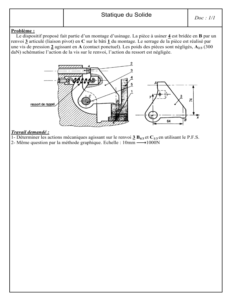 Statique du Solide Doc : 1/1 Problème : Le dispositif proposé fait partie d’un montage d’usinage. La pièce à usiner 4 est bridée en B par un renvoi 3 articulé (liaison pivot) en C sur le bâti 1 du montage. Le serrage de la pièce est réalisé par une vis de pression 2 agissant en A (contact ponctuel). Les poids des pièces sont négligés, A2/3 (300 daN) schématise l’action de la vis sur le renvoi, l’action du ressort est négligée. Travail demandé : 1- Déterminer les actions mécaniques agissant sur le renvoi 3 B4/3 et C1/3 en utilisant le P.F.S. 2- Même question par la méthode graphique. Echelle : 10mm 1000N
