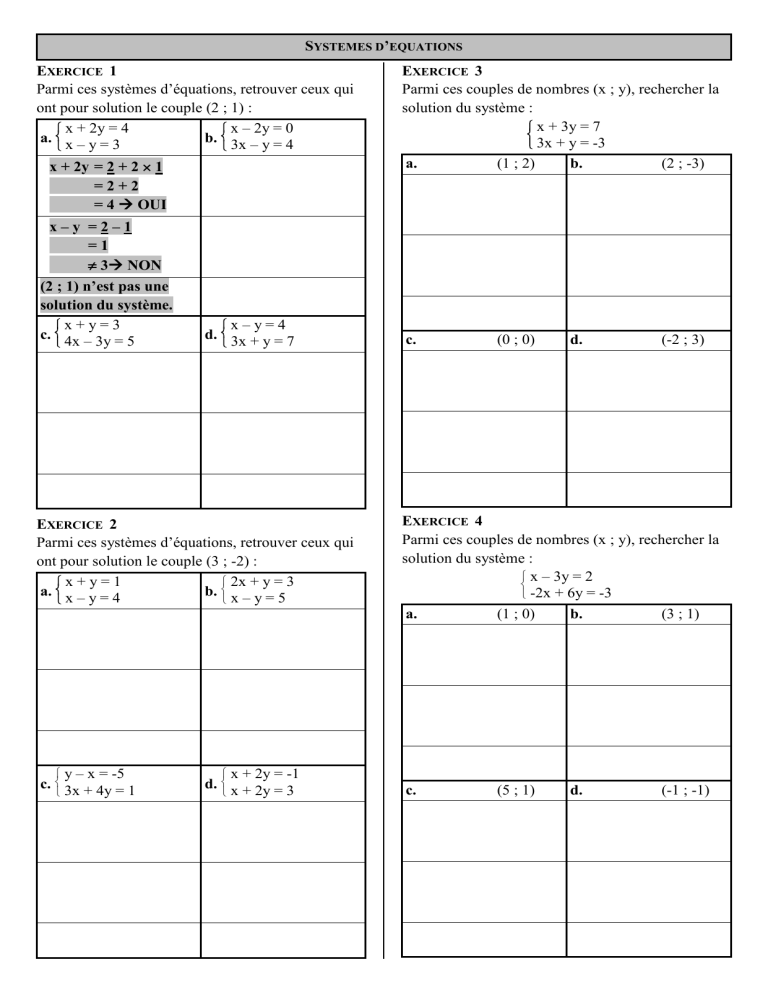 SYSTEMES D’EQUATIONS EXERCICE 1 Parmi ces systèmes d’équations, retrouver ceux qui ont pour solution le couple (2 ; 1) : x + 2y = 4 x – 2y = 0 a. x – y = 3 b. 3x – y = 4 x + 2y = 2 + 2 1 =2+2 = 4 OUI x–y =2–1 =1 3 NON (2 ; 1) n’est pas une solution du système. x+y=3 c. 4x – 3y = 5 x–y=4 d. 3x + y = 7 EXERCICE 2 Parmi ces systèmes d’équations, retrouver ceux qui ont pour solution le couple (3 ; -2) : x+y=1 2x + y = 3 b. x – y = 5 a. x – y = 4 y – x = -5 c. 3x + 4y = 1 x + 2y = -1 d. x + 2y = 3 EXERCICE 3 Parmi ces couples de nombres (x ; y), rechercher la solution du système : x + 3y = 7 3x + y = -3 a. (1 ; 2) b. (2 ; -3) c. (0 ; 0) d. (-2 ; 3) EXERCICE 4 Parmi ces couples de nombres (x ; y), rechercher la solution du système : x – 3y = 2 -2x + 6y = -3 a. (1 ; 0) b. (3 ; 1) c. (5 ; 1) d. (-1 ; -1) SYSTEMES D’EQUATIONS Collège La Providence - Montpellier EXERCICE 3 x + 3y = 7 CORRIGE Considérons le système : 3x + y = -3 EXERCICE 1 Testons le couple (2 ; 1) : x + 2y = 4 x – 2y = 0 a. x – y = 3 b. 3x – y = 4 x 2 y 2 2 1 x + 2y = 2 + 2 1 0 OUI =2+2 = 4 OUI 3x y 3 2 1 x–y =2–1 =1 5 NON 3 NON (2 ; 1) n’est pas une (2 ; 1) n’est pas une solution du système. solution du système. x+y=3 x–y=4 c. 4x – 3y = 5 d. 3x + y = 7 x y 2 1 x y 2 1 1 NON 3 OUI 4 x 3 y 4 2 3 1 5 OUI (2 ; 1) est une solution du système. a. (2 ; -3) x 3 y 2 3 3 7 NON 5 NON (1 ; 2) n’est pas une solution du système. c. (0 ; 0) x 3y 0 3 0 0 NON (2 ; -3) n’est pas une solution du système. d. (-2 ; 3) x 3 y 2 3 3 7 OUI 3x y 3 2 3 3 OUI (0 ; 0) n’est pas une solution du système. (-2 ; 3) est une solution du système. EXERCICE 4 (2 ; 1) n’est pas une solution du système. EXERCICE 2 Testons le couple (3 ; -2) : x+y=1 2x + y = 3 b. x – y = 5 a. x – y = 4 x y 3 2 2 x y 2 3 2 1 OUI 4 NON x y 3 2 5 NON (3 ; -2) n’est pas une solution du système. y – x = -5 c. 3x + 4y = 1 y x 2 3 5 OUI (3 ; -2) n’est pas une solution du système. x + 2y = -1 d. x + 2y = 3 3x 4 y 3 3 4 2 x 2 y 3 2 2 (3 ; -2) est une solution du système. b. 3x y 3 1 2 x – 3y = 2 Considérons le système : -2x + 6y = -3 a. 1 OUI (1 ; 2) x 3y 1 3 2 7 OUI x 2 y 3 2 2 1 OUI 1 NON (3 ; -2) n’est pas une solution du système. (1 ; 0) x 3y 1 3 0 1 NON b. (3 ; 1) x 3 y 3 3 1 0 NON (1 ; 0) n’est pas une solution du système. c. (5 ; 1) x 3 y 5 3 1 2 OUI (3 ; 1) n’est pas une solution du système. d. (-1 ; -1) 2 x 6 y 2 5 6 1 2 x 6 y 2 1 6 1 4 NON (5 ; 1) n’est pas une solution du système. x 3 y 1 3 1 2 OUI 4 NON (-1 ; -1) n’est pas une solution du système.
