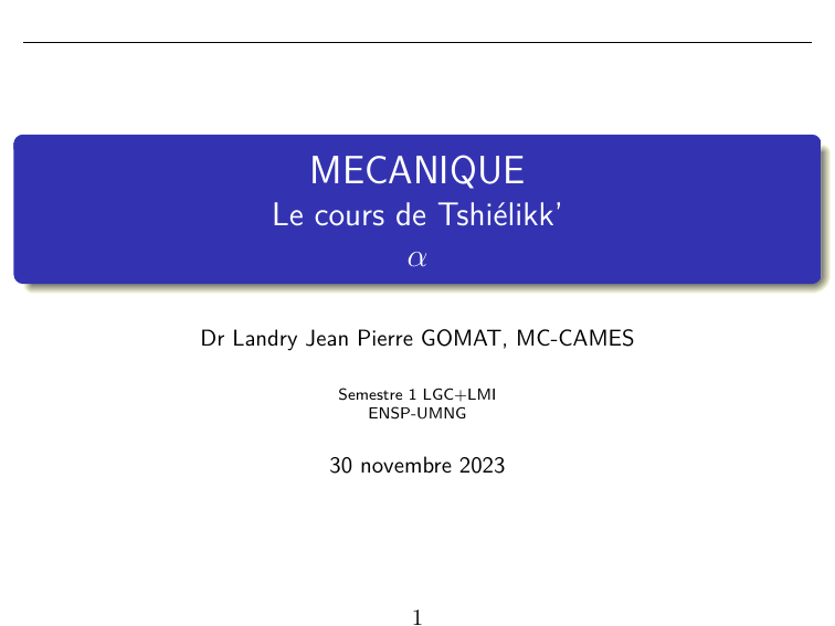MECANIQUE Le cours de Tshiélikk’ α Dr Landry Jean Pierre GOMAT, MC-CAMES Semestre 1 LGC+LMI ENSP-UMNG 30 novembre 2023 1 Introduction La mécanique est une partie de la Physique qui étudie les mouvements et leurs causes. Elle comprend deux parties essentielles : la cinématique, qui a pour objet la description des mouvements sans se préoccuper de ce qui les provoque (on parle du principe d’objectivité qui permet de dire une réalité, la même pour tous), et la dynamique qui étudie les relations entre ces mouvements et leurs causes (on parle du principe de causalité ou du déterminisme qui voudrait que tout ait une cause et que des conditions -initiales et aux limites- données déterminent l’avenir d’un système. Ce déterminisme tombe lorsqu’il s’agit de mouvement de particules (les très petits systèmes matériels -typiquement les éléments constitutifs de la matière-) qui rentre dans le domaine de la mécanique quantique où les mêmes conditions données peuvent conduire des systèmes à des comportements différents. Si la vitesse d’un système est proche de celle de la lumière, de nouveau, la mécanique classique ne s’applique plus pour faire place à la mécanique relativiste. 2 Introduction Deux principes fondamentaux fondent donc l’univers que toute la science dont la mécanique que nous avons commencé d’étudier exprime comme suit : Le principe de causalité : la réponse d’un système à l’instant t actuel ne dépend que de son histoire antérieure. La contrainte actuelle ne dépend que du mouvement et des sollicitations passées ou actuels. On dit aussi qu’une loi est déterministe. Autrement dit : tout ce qui existe a une cause ou est dû à un passé déterminant. Tout vient de tout, rien ne vient de rien. Le principe d’universalité qu’on appelle aussi principe d’objectivité : une loi de comportement d’un système doit être objective c’est-à-dire la même pour tous les observateurs. Cette condition d’objectivité suppose une invariance pour les changements de chronologie (changement d’origine des temps et/ou changement d’unités de temps), et une invariance pour les changements des repères. Dans ce cours, on étudie les lois fondamentales de la dynamique du point et du solide : description d’un système mécanique, inventaire des forces qui s’y appliquent, application des lois de Newton, calcul du travail de ces forces de sorte à pouvoir réaliser le bilan énergétique d’une particule puis d’un système et expliquer son mouvement. 3 ...Introduction Figure: LANIAKEA : Représentation simulée du supercluster de notre galaxie. 4 ...Introduction Figure: La voie lactée : notre galaxie. 5 ...Introduction Figure: Le système solaire. 6 ...Introduction Figure: La Terre : notre planète. 7 ...Introduction : le génie civil Figure: Une tour gratte ciel à Abu Dhabi. Figure: L’aéroport de Hong Kong. 8 ...Introduction : le génie civil Figure: Canal de Panama. Figure: Echangeur à Abidjan. 9 ...Introduction : le génie civil Figure: Tour Nabemba à Tandala. Figure: Tour Eiffel à Paris. 10 ...Introduction : le génie civil Figure: Marina Bay à Singapour. Figure: Viaduc de Kintélé. 11 ...Introduction : le génie civil Figure: Pont suspendu en France. Figure: Pont au Viet-Nam. 12 ...Introduction : le génie civil Figure: Stade de Kintélé. Figure: Une maison à Songolo. 13 L’espace vectoriel euclidien Le monde dans lequel nous vivons, notre milieu, on dit de plus en plus l’environnement que nous composons et mais aussi celui qui nous compose a été schématisé ou modélisé, comme un ensemble de points plus ou moins denses auxquels on a associé une quantité de matière ou une masse, qui interagissent. Il est représenté en mathématiques par un espace affine (ensemble de points réglementé par des propriétés le caractérisant) dans lequel on peut mesurer la distance entre deux points. Il sera noté E . Le point est l’être le plus petit de cet ensemble. On dit alors qu’il est un élément de E . Le point est un être mathématique dépourvu de dimension. On dit que sa dimension est nulle c’est-à-dire qu’elle est infiniment petite ou infinitésimale. Les points sont associés à des grandeurs dites scalaires c’est-à-dire entièrement déterminées par leur valeur numériques (la masse, la longueur, la pression, l’énergie, la température, ...). On identifie E à l’espace ordinaire dans lequel nous vivons, le monde, qui est un espace réel. A partir de cet espace, on a construit des modèles de tous les êtres qui existent dans le monde, la nature. C’est ainsi qu’on a créé un être de points dont les caractéristiques ont permis la construction d’un modèle de l’univers : le vecteur. L’espace vectoriel euclidien : le vecteur Le vecteur est un ensemble de points alignés dans un segment orienté. Il a une origine et extrêmité et est caractérisé par un point d’application, une direction, un sens et une mesure. Figure: Représentation d’un vecteur. Le vecteur a été choisi comme élément d’un ensemble considéré comme un espace réel de trois dimensions noté R3 associé à E. Une dimension représente une ligne infinie (ou ouverte) et droite notée R. L’espace que nous considérons est régi par des propriétés qui fondent cet ensemble appelé espace vectoriel. 15 L’espace vectoriel euclidien : propriétés L’espace vectoriel R3 est un espace des translations des éléments de E en vecteurs (ses éléments) ou grandeurs dites vectorielles c’est-à-dire déterminées par leur droite d’action ou direction, leur sens et leur mesure (la position, la vitesse, la force, le moment,... sont des vecteurs). L’espace vectoriel à trois dimensions que nous considérons est le plus simple qui ait été conçu pour appréhender la nature. Il est défini ainsi qu’il suit : on dit que R3 est un espace vectoriel tridimensionnel ou de dimension trois, lorsque : Le