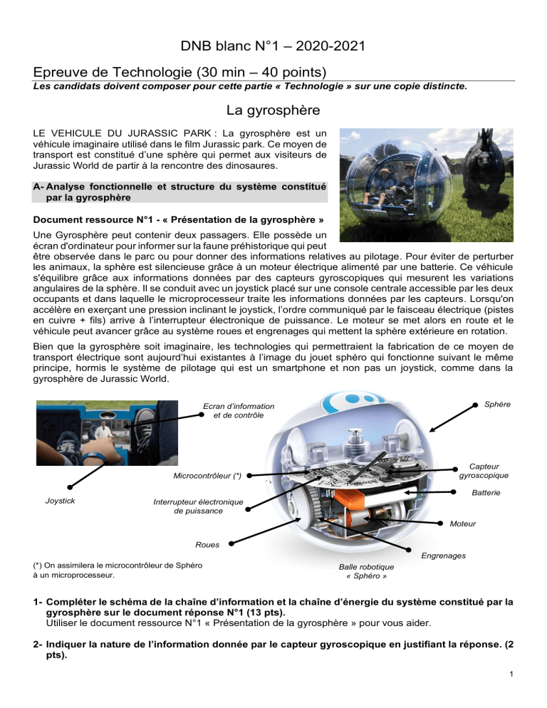 DNB blanc N°1 – 2020-2021 Epreuve de Technologie (30 min – 40 points) Les candidats doivent composer pour cette partie « Technologie » sur une copie distincte. La gyrosphère LE VEHICULE DU JURASSIC PARK : La gyrosphère est un véhicule imaginaire utilisé dans le film Jurassic park. Ce moyen de transport est constitué d’une sphère qui permet aux visiteurs de Jurassic World de partir à la rencontre des dinosaures. A- Analyse fonctionnelle et structure du système constitué par la gyrosphère Document ressource N°1 - « Présentation de la gyrosphère » Une Gyrosphère peut contenir deux passagers. Elle possède un écran d'ordinateur pour informer sur la faune préhistorique qui peut être observée dans le parc ou pour donner des informations relatives au pilotage. Pour éviter de perturber les animaux, la sphère est silencieuse grâce à un moteur électrique alimenté par une batterie. Ce véhicule s'équilibre grâce aux informations données par des capteurs gyroscopiques qui mesurent les variations angulaires de la sphère. Il se conduit avec un joystick placé sur une console centrale accessible par les deux occupants et dans laquelle le microprocesseur traite les informations données par les capteurs. Lorsqu'on accélère en exerçant une pression inclinant le joystick, l’ordre communiqué par le faisceau électrique (pistes en cuivre + fils) arrive à l’interrupteur électronique de puissance. Le moteur se met alors en route et le véhicule peut avancer grâce au système roues et engrenages qui mettent la sphère extérieure en rotation. Bien que la gyrosphère soit imaginaire, les technologies qui permettraient la fabrication de ce moyen de transport électrique sont aujourd’hui existantes à l’image du jouet sphéro qui fonctionne suivant le même principe, hormis le système de pilotage qui est un smartphone et non pas un joystick, comme dans la gyrosphère de Jurassic World. Sphère Ecran d’information et de contrôle Capteur gyroscopique Microcontrôleur (*) Batterie Joystick Interrupteur électronique de puissance Moteur Roues Engrenages (*) On assimilera le microcontrôleur de Sphéro à un microprocesseur. Balle robotique « Sphéro » 1- Compléter le schéma de la chaîne d’information et la chaîne d’énergie du système constitué par la gyrosphère sur le document réponse N°1 (13 pts). Utiliser le document ressource N°1 « Présentation de la gyrosphère » pour vous aider. 2- Indiquer la nature de l’information donnée par le capteur gyroscopique en justifiant la réponse. (2 pts). 1 B- Programmation du fonctionnement de la gyrosphère Document ressource N°2 – « Fonctionnement attendu de la gyrosphère » Lors de la location de la gyrosphère, un code de démarrage est communiqué à l’utilisateur. La durée de la visite en gyrosphère étant de 30 minutes, lors du départ le taux de charge de la batterie doit être supérieur à 80%. C’est une fois ces conditions réunies que l’action sur le joystick permet de manœuvrer la gyrosphère dans les quatre directions : Inclinaison vers l’avant pour avancer – Vers la gauche pour tourner à gauche – Vers la droite pour tourner à droite – Vers l’arrière pour reculer. La position neutre du joystick provoque l’arrêt de la gyrosphère. Un compteur affiche en permanence le temps écoulé depuis le départ afin que l’utilisateur puisse gérer son parcours. Ce compteur est remis à zéro au début de la promenade suivante. Le programme ci-dessous réalisé avec le logiciel mBlock permet d’obtenir le fonctionnement attendu de la gyrosphère. Programme N°1 Fonctionnement de la gyrosphère 3- Compléter l’algorigramme du fonctionnement de la gyrosphère avec les informations manquantes. (9 pts) Utiliser le document ressource N°2 « Fonctionnement attendu de la gyrosphère » et le programme N°1 pour vous aider. 2 C- Transmission et traitement des données de la gyrosphère Document ressource N°3 – « La géolocalisation » Les gyrosphères sont connectées au réseau informatique du parc Jurassic World pour gérer les données diffusées sur l’écran de la gyrosphère et pour des raisons de sécurité. L’informaticien réseau du centre de traitement doit en particulier connaître en permanence la position de la gyrosphère et la positionner sur le plan du parc à l'aide de ses coordonnées géographiques. Un boitier GPS embarqué dans la gyrosphère capte les signaux émis par le réseau de satellites GPS et peut ensuite calculer sa position géographique de 10 à 15 mètres près. Le boitier GPS met à jour sa position toutes les secondes. Ce boitier transmet les données de géolocalisation en temps réel par ondes radios vers l’antenne du réseau de communication GSM reliée à Internet. La liaison Internet par fibre optique achemine ensuite rapidement les données vers le centre de traitement du parc qui les traite. La position de la gyrosphère s’affiche alors sur le plan du parc de l’écran de contrôle 4- Relier les éléments de la chaîne de transmission des données sur le schéma du document réponse N°3 en respectant les types des liaisons utilisés (8 pts) Utiliser le document ressource N°3 « La géolocalisation » pour vous aider. Document ressources N°4 – « L’adressage » Le réseau informatique du parc Jurassick World est un Intranet, c’est-à-dire qu’il s’agit d’un réseau local (LAN) utilisant les services d’Internet de manière privative. L’administrateur du réseau nous a communiqué les informations ci-dessous relatives à l’adressage des équipements du réseau en service : Le masque de sous-réseau est : 255.255.255.0 Gyrosphère N°3 Gyrosphère N°8 Gyrosphère N°15 Routeur Serveur du centre de traitement Ordinateur de l’informaticien IP 10.15.1.3 IP 10.15.2.8 IP 10.15.1.15 IP 10.15.1.1 IP 10.15.1.254 IP 10.15.1.102 L’informaticien constate que l’une des trois gyrosphères ne parvient pas à c