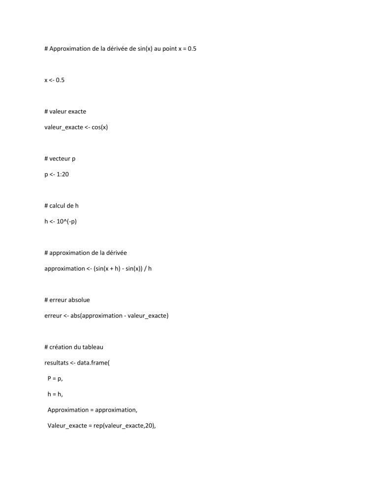 # Approximation de la dérivée de sin(x) au point x = 0.5 x <- 0.5 # valeur exacte valeur_exacte <- cos(x) # vecteur p p <- 1:20 # calcul de h h <- 10^(-p) # approximation de la dérivée approximation <- (sin(x + h) - sin(x)) / h # erreur absolue erreur <- abs(approximation - valeur_exacte) # création du tableau resultats <- data.frame( P = p, h = h, Approximation = approximation, Valeur_exacte = rep(valeur_exacte,20), Erreur_absolue = erreur ) # afficher le tableau print(resultats) # afficher la valeur exacte cat("Valeur exacte de cos(0.5) =", valeur_exacte) # exporter le tableau write.csv(resultats,"approximation_derivative_sin.csv",row.names = FALSE)