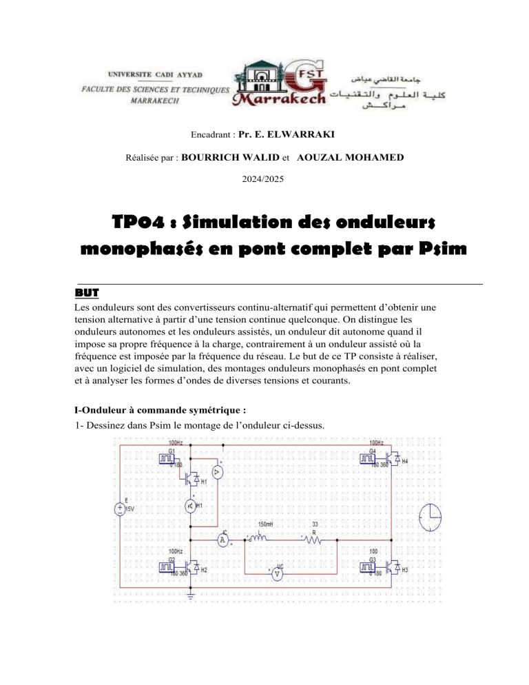Encadrant : Pr. E. ELWARRAKI Réalisée par : BOURRICH WALID et AOUZAL MOHAMED 2024/2025 TP04 : Simulation des onduleurs monophasés en pont complet par Psim BUT Les onduleurs sont des convertisseurs continu-alternatif qui permettent d’obtenir une tension alternative à partir d’une tension continue quelconque. On distingue les onduleurs autonomes et les onduleurs assistés, un onduleur dit autonome quand il impose sa propre fréquence à la charge, contrairement à un onduleur assisté où la fréquence est imposée par la fréquence du réseau. Le but de ce TP consiste à réaliser, avec un logiciel de simulation, des montages onduleurs monophasés en pont complet et à analyser les formes d’ondes de diverses tensions et courants. I-Onduleur à commande symétrique : 1- Dessinez dans Psim le montage de l’onduleur ci-dessus. 2- Visualisez, dans quatre graphes séparés : -La tension UC aux bornes de la charge -Le courant iC dans la charge, - La tension VH1 aux bornes de l'interrupteur H1 - Le courant iH1 de l'interrupteur H1. 5- Mesurez la valeur efficace de la tension UC Uc=E=15V II- Onduleur à commande décalée Dans le même schéma précèdent modifier : - La commande de G1 : 0 180 - La commande de G4 : 180 360 - La commande de G2 : 180+α α+360 - La commande de G3 : α α+180 On donne α = 45° - La tension UC aux bornes de la charge, - Le courant iC dans la charge, - La tension VH1 aux bornes de l'interrupteur H1, - Le courant iH1 de l'interrupteur H1. 2Mesurez, pour différentes valeurs d’alpha (α=45°, 90°, 135°) la valeur efficace de la tension Uc. α (°) Uc (V) 45 13.5 90 11.7 135 8 .6 3La commande décalée permet d’avoir un meilleur signal sinusoïdale avec une valeur efficace inférieur à E .