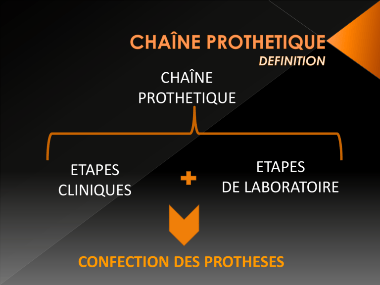 CHAÎNE PROTHETIQUE ETAPES CLINIQUES ETAPES DE LABORATOIRE CONFECTION DES PROTHESES C Observation clinique L Empreinte primaire A Coulée L I Empreinte secondaire Coulée N I Rapport inter-maxillaire Q U PEI Maquette Essayage Pose Suivi O R A Montage E B T O I Finition R E CHAÎNE PROTHETIQUE ETAPES CLINIQUES PRATICIENS ASSISTANTS DENTAIRES TECHNICIENS DE SURFACE ETAPES DE LABORATOIRE PROTHESISTE PERSONNEL DE LABORATOIRE