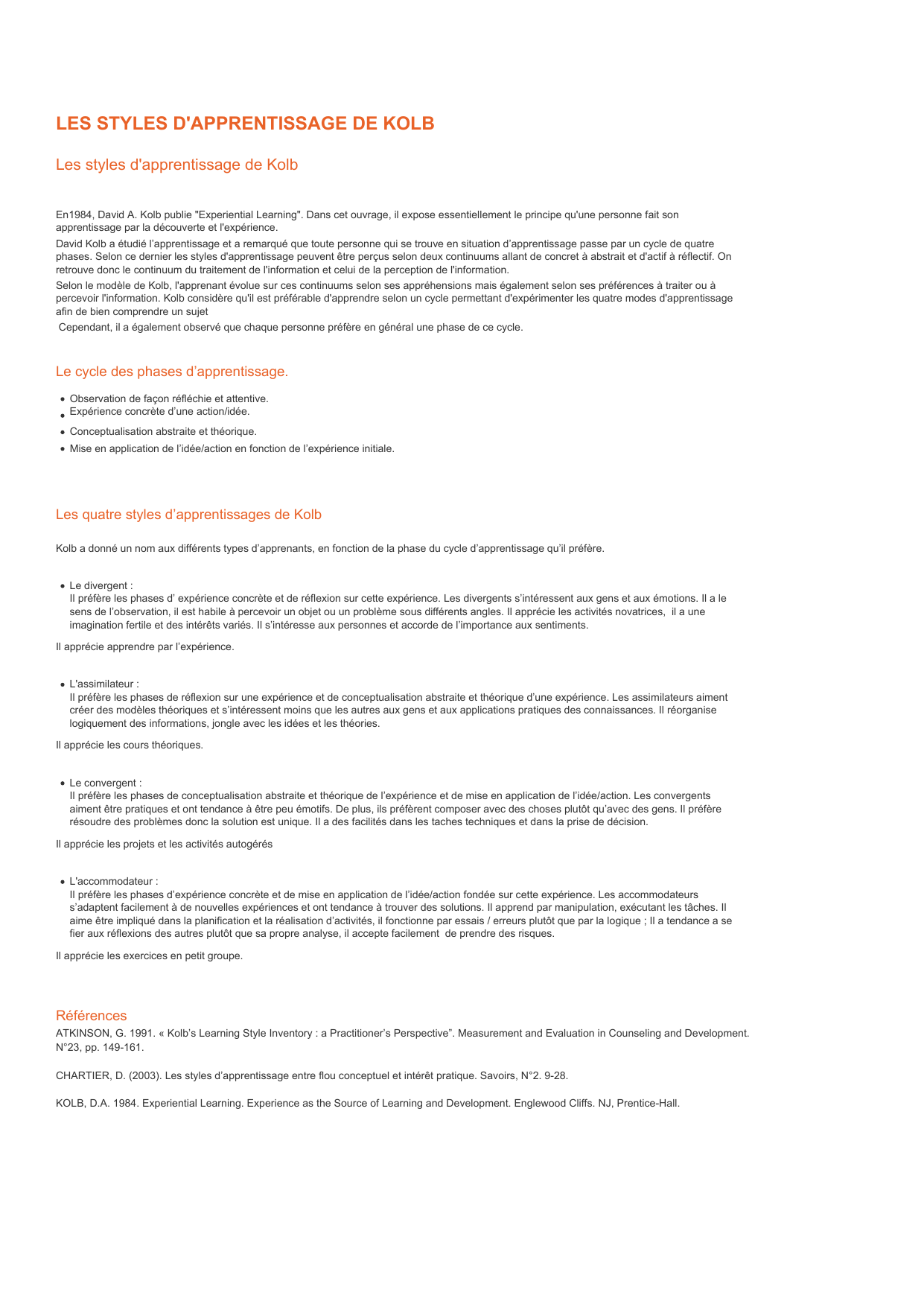 ATKINSON, G. 1991. « Kolb’s Learning Style Inventory : a Practitioner’s Perspective”. Measurement and Evaluation in Counseling and Development.