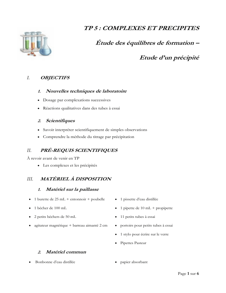 TP 5 : COMPLEXES ET PRECIPITES Étude des équilibres de formation – Etude d’un précipité OBJECTIFS I. 1. Nouvelles techniques de laboratoire Dosage par complexations successives Réactions qualitatives dans des tubes à essai 2. Scientifiques Savoir interpréter scientifiquement de simples observations Comprendre la méthode du titrage par précipitation PRÉ-REQUIS SCIENTIFIQUES II. À revoir avant de venir en TP Les complexes et les précipités III. MATÉRIEL À DISPOSITION 1. Matériel sur la paillasse 1 burette de 25 mL + entonnoir + poubelle 1 pissette d’eau distillée 1 bécher de 100 mL 1 pipette de 10 mL + propipette 2 petits béchers de 50 mL 11 petits tubes à essai agitateur magnétique + barreau aimanté 2 cm portoirs pour petits tubes à essai 1 stylo pour écrire sur le verre Pipettes Pasteur 2. Matériel commun Bonbonne d’eau distillée papier absorbant Page 1 sur 6 PRODUITS À DISPOSITION IV. Produits sur la paillasse 1 flacon compte-gouttes de Co(NO3)2 0,1 M 1 flacon compte-gouttes de NaOH à 1 M 1 flacon compte-gouttes de orthophénantroline à 1 flacon compte-gouttes de NH3 concentré 0,025 M 1 flacon compte-gouttes de H2SO4 à 2 M 1 flacon compte-gouttes de FeSO4 0,1 M 1 flacon compte-gouttes de NH4SCN saturée 1 flacon compte-gouttes de Fe(NO3)3 0,1 M 3 dosettes de sérum physiologique 1 flacon compte-gouttes de AgNO3 0,1 M solution de nitrate d’argent à 0,100 M 1 flacon compte-gouttes de NaCl 1 M DONNÉES V. pKS (AgCl) = 9,8 M(NaCl) = 58,44 g.mol-1 FICHES DE SÉCURITÉ DES PRODUITS CHIMIQUES VI. Faites une fiche de sécurité pour chacun des produits que vous manipulerez VII. ÉTUDE DES ÉQUILIBRES DE FORMATION DE COMPLEXES Vous allez former différents complexes ou précipités. Vous les mettrez en évidence en observant soit le changement de couleur des solutions, soit la formation de précipités. Ces observations s’expliqueront par des déplacements d’équilibres. 1. Équations pouvant intervenir dans les expériences Complexes ou solides complètement dissociés dans l’eau : Co(NO3)2 Co2+ + 2 NO3- FeSO4 Fe2+ + Fe(NO3)3 Fe3+ + 3 NO3- NH4SCN NH4+ + SCN- SO42- Page 2 sur 6 AgNO3 Ag+ + NO3- NaCl Na+ + Cl- NaF Na+ + F- CaCl2 Ca2+ + 2 Cl- MgCl2 Mg2+ + 2 Cl- Complexes ou solides partiellement dissociés dans l’eau : Co2+(aq) + 6 H2O(aq) Co(H2O) 26 + est rose Ag(NH3)2 (aq) Ag+(aq) + 2 NH3(aq) Ag(NH3)2 est incolore AgCl(s) Ag+(aq) + Cl–(aq) AgCl est blanc Fe(SCN)2+(aq) Fe3+(aq) + SCN–(aq) Fe(SCN)2+ est rouge sang Fe(o.ph)3 (aq) Fe2+(aq) + 3 o.ph Fe(o.ph)3 (aq est vermillon Co(SCN)+(aq) Co2+(aq) + SCN–(aq) Co(SCN)+ est bleu Co(H2O) 26 + (aq) + 2+ sens : + 2+ Fe3+ (aq) + 3 HO-(aq) Fe(OH)3 (s) Fe(OH)3 est brun Co2+ (aq) + 2 HO-(aq) Co(OH)2 (s) Co(OH)2 est rose ou bleu Réactions acido-basiques : NH4+ + H2O HSO4- + H3O+ H2SO4 + H2O NH4+ + HO- NH3 + H3O+ NH3 + H2O Page 3 sur 6 2. Formation de complexes, rôle de différents paramètres (essais qualitatifs) Pour chaque série, faites la manipulation telle qu'elle est indiquée dans le tableau correspondant, puis notez vos observations (couleur, présence d'un précipité, sa couleur, …) pour chacun des tubes de la série et enfin interprétez vos observations en indiquant les réactions chimiques qui interviennent, voire la réaction bilan le cas échéant, et leur sens prépondérant. N’oubliez pas que certains tubes doivent être observés verticalement et latéralement : - l’observation verticale V permet de « voir » la quantité de matière - l’observation latérale H permet de « voir » la concentration de la V matière Les solutions à votre disposition sont toutes des solutions aqueuses. H Aide : On considèrera que 1 mL équivaut à peu près à 1 cm de haut rempli dans le tube. 2a. Effet de la dilution sur la stabilité des complexes Cas du nitrate de Co(II) Tube A Tube B Solution Co(NO3)2 10−1 M 1 ml 1 ml eau / Tube rempli au 2/3 Cas du complexe Fer(II)/orthophénantroline formule de l'orthophénantroline : N Tube C Tube D Tube E Solution o.phénantroline 1 ml 1 ml 1 ml Solution FeSO4 10−1 M / 2 gouttes 2 gouttes eau / / Tube rempli au 2/3 N Page 4 sur 6 2b. Déplacement d’un équilibre de précipitation par formation d’un complexe soluble Tube K Tube L Tube M eau 2 mL 2 mL 2 mL Solution AgNO3 10−1 M 3 gouttes 3 gouttes 3 gouttes Solution NaCl 1 M 1 goutte 1 goutte 1 goutte Solution NH3 concentrée / 6 gouttes 6 gouttes Solution H2SO4 2 M / / 3 gouttes 2c. Compétition entre complexes et précipité Solution Co(NO3)2 10−1 M Tube R Tube S Tube T Tube U Tube V 4 4 gouttes 4 gouttes / 4 gouttes 4 gouttes 4 gouttes 4 gouttes gouttes Solution SATUREE 4 NH4SCN gouttes Solution Fe(NO3)3 10−1 M / 4 gouttes / 4 gouttes 4 gouttes Solution NaOH 1 M / / 5 gouttes / 5 gouttes VIII. TITRAGE ARGENTIMÉTRIQUE DES IONS CHLORURE DANS LE SERUM PHYSIOLOGIQUE 1. Introduction Le sérum physiologique est très utilisé par les parents pour nettoyer les yeux et le nez des jeunes enfants. Il est composé d’une eau pure et de chlorure de sodium à 9,00 g.L-1. Il contient 0,90 % en masse de chlorure de sodium. Il se présente sous forme de dosettes de 5 mL jetables pour éviter toute contamination de la solution avec des virus ou des bactéries. 2. L’expérience Calculez le volume équivalent attendu lors du dosage de 10,0 mL de sérum physiologique par une solution de nitrate d’argent à 0,100 M. Page 5 sur 6 Effectuez ensuite le dosage précis de 10,0 mL de sérum physiologique à l’aide - d’une électrode d’argent combinée (elle contient à la fois l’électrode de mesure active en argent et l’électrode de référence au calomel) - et de la solution titrante de nitrate d’argent à 0,100 M. 3. Interprétation et conclusion Déterminer la concentration massique du sérum physiologique. Déterminer le pourcentage en masse de chlorure de sodium. Concluez. COMPTE-RENDU DE LA SÉANCE IX. Rédigez un compte rendu de la séance sur le schéma suivant : Introduction du TP Fich