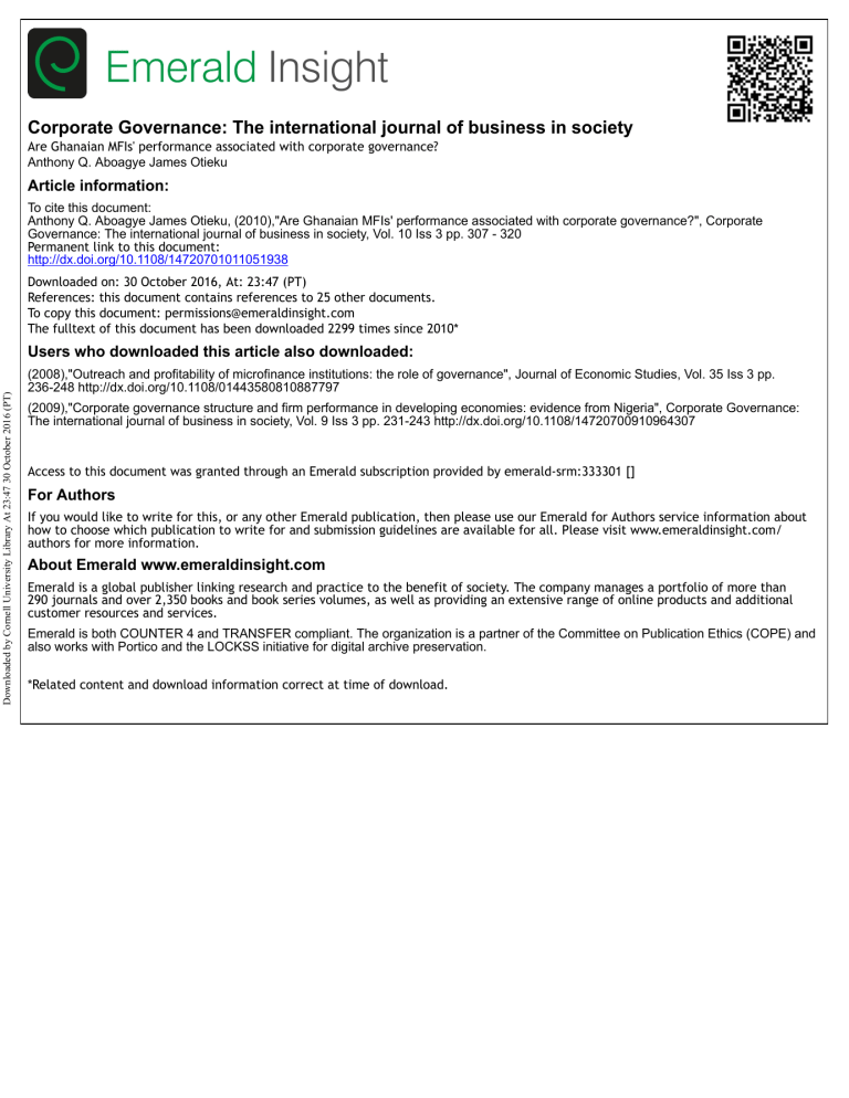 Corporate Governance: The international journal of business in society Are Ghanaian MFIs' performance associated with corporate governance? Anthony Q. Aboagye James Otieku Article information: To cite this document: Anthony Q. Aboagye James Otieku, (2010),"Are Ghanaian MFIs' performance associated with corporate governance?", Corporate Governance: The international journal of business in society, Vol. 10 Iss 3 pp. 307 - 320 Permanent link to this document: http://dx.doi.org/10.1108/14720701011051938 Downloaded on: 30 October 2016, At: 23:47 (PT) References: this document contains references to 25 other documents. To copy this document: [email protected] The fulltext of this document has been downloaded 2299 times since 2010* Downloaded by Cornell University Library At 23:47 30 October 2016 (PT) Users who downloaded this article also downloaded: (2008),"Outreach and profitability of microfinance institutions: the role of governance", Journal of Economic Studies, Vol. 35 Iss 3 pp. 236-248 http://dx.doi.org/10.1108/01443580810887797 (2009),"Corporate governance structure and firm performance in developing economies: evidence from Nigeria", Corporate Governance: The international journal of business in society, Vol. 9 Iss 3 pp. 231-243 http://dx.doi.org/10.1108/14720700910964307 Access to this document was granted through an Emerald subscription provided by emerald-srm:333301 [] For Authors If you would like to write for this, or any other Emerald publication, then please use our Emerald for Authors service information about how to choose which publication to write for and submission guidelines are available for all. Please visit www.emeraldinsight.com/ authors for more information. About Emerald www.emeraldinsight.com Emerald is a global publisher linking research and practice to the benefit of society. The company manages a portfolio of more than 290 journals and over 2,350 books and book series volumes, as well as providing an extensive range of online products and additional customer resources and services. Emerald is both COUNTER 4 and TRANSFER compliant. The organization is a partner of the Committee on Publication Ethics (COPE) and also works with Portico and the LOCKSS initiative for digital archive preservation. *Related content and download information correct at time of download. Are Ghanaian MFIs’ performance associated with corporate governance? Downloaded by Cornell University Library At 23:47 30 October 2016 (PT) Anthony Q. Aboagye and James Otieku Anthony Q. Aboagye and James Otieku are both Senior Lecturers at the University of Ghana Business School, Legon, Ghana. Abstract Purpose – The purpose of this paper is to determine whether in Ghana, corporate governance, outreach to clients, reduced dependence on subsidies and use of modern technology (together called corporate governance plus) are associated with the performance of rural and community banks (RCBs), which are microfinance institutions (MFI), in the context of newly adopted codes of conduct and regulations, ownership rules and quality of management. Design/methodology/approach – A total of 30 randomly sampled RCBs were categorized into four groups based on analysis of several dimensions of financial performance. Next, RCBs were again categorized into four groups based on their corporate governance plus. A chi-squared test of independence between the two groupings was performed. Findings – The authors found no association between RCBs’ categories based on corporate governance plus and their categories based on financial performance. Practical implication – To enhance performance, corporate governance plus must impact financial performance as documented by OECD. Laws and codes of conduct recently designed to guide the conduct of business should be allowed to work. The restriction on individual ownership of RCBs to 30 percent should be relaxed. And RCBs should pay attention to developing the competencies of their boards and senior management. Originality/value – This is the first formal test of the association between state of corporate governance plus and financial performance of microfinance institutions in Ghana. Keywords Corporate governance, Performance management, Financial performance, Ghana, Banks Paper type Research paper 1. Introduction This paper attempts to explain the lackluster performance of rural and community banks (RCBs) in Ghana from the point of view of their state of corporate governance. RCBs belong to the broad class of financial institutions referred to as microfinance institutions (MFIs). They are special purpose financial institutions established to facilitate access to institutional credit and banking services by people living in rural areas. This, it is expected, will help improve the socio-economic well-being of the majority of Ghanaians, who live in rural areas and are mostly engaged in farming, fishing, trading and cottage industries with little access to commercial banks. Received 31 October 2008 Revised 27 January 2009 24 February 2009 Accepted 27 February 2009 This study was funded by the University of Ghana Business School and the Government of Ghana (GETFUND). DOI 10.1108/14720701011051938 The concept of RCB was operationalized in Ghana in 1976. RCBs in Ghana are community-owned and community-run unit banks. That is, they operate as banks but are not allowed to operate fully fledged branches in other communities. The key functions of RCBs are (Bank of Ghana, 2006) to: B Mobilize savings in the rural communities and channel them into the provision of credit to rural dwellers. VOL. 10 NO. 3 2010, pp. 307-320, Q Emerald Group Publishing Limited, ISSN 1472-0701 j CORPORATE GOVERNANCE j PAGE 307 B Monetize the rural communities by way of inculcating in rural dwellers the banking habit. B Serve as instruments for the development of business in the rural communities and thereby facilitate rapid growth of the national economy. A review of deposit mobilization, lending activities