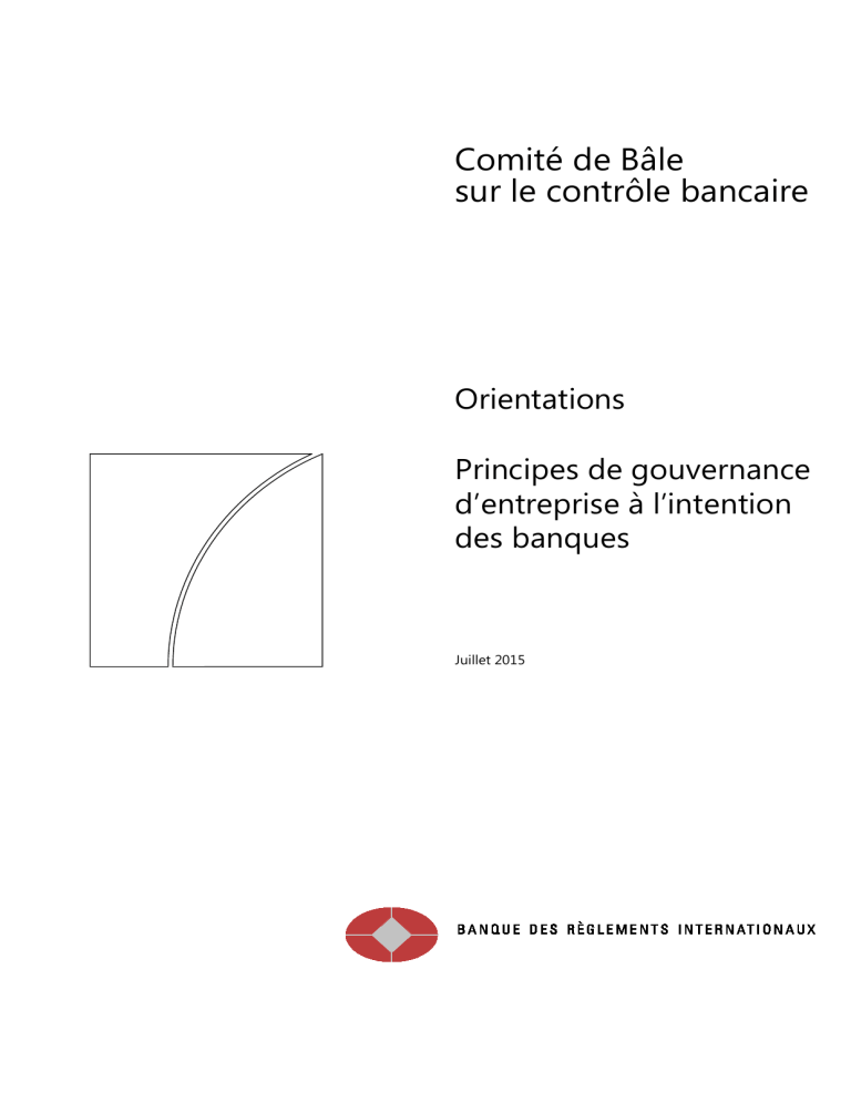 Comité de Bâle sur le contrôle bancaire Orientations Principes de gouvernance d’entreprise à l’intention des banques Juillet 2015 Le présent document est traduit de l’anglais. En cas de doute ou d’ambiguïté, se reporter à l’original (Corporate governance principles for banks). Publication également disponible sur le site de la BRI (www.bis.org). © Banque des Règlements Internationaux, 2015. Tous droits réservés. De courts extraits peuvent être reproduits ou traduits sous réserve que la source en soit citée. ISBN 978-92-9197-187-9 (en ligne) Sommaire Glossaire ................................................................................................................................................................................................ 1 Principes de gouvernance d’entreprise à l’intention des banques................................................................................ 3 Introduction ................................................................................................................................................................................ 3 Différences entre juridictions .............................................................................................................................................. 5 Applicabilité, proportionnalité et différences des approches en matière de gouvernance ....................... 6 Principe 1 – Responsabilités générales du conseil d’administration ................................................................. 8 Principe 2 – Composition et qualifications du conseil d’administration ........................................................ 13 Principe 3 – Structure et pratiques du conseil d’administration ........................................................................ 15 Principe 4 – Direction .......................................................................................................................................................... 21 Principe 5 – Gouvernance des groupes bancaires................................................................................................... 23 Principe 6 – Fonction gestion des risques .................................................................................................................. 26 Principe 7 – Détection, suivi et contrôle des risques .............................................................................................. 28 Principe 8 – Communication en matière de risque ................................................................................................. 31 Principe 9 – Conformité ..................................................................................................................................................... 33 Principe 10 – Audit interne ............................................................................................................................................... 34 Principe 11 – Rémunération ............................................................................................................................................. 35 Principe 12 – Information et transparence ................................................................................................................. 37 Principe 13 – Rôle des autorités de contrôle............................................................................................................. 39 Principes de gouvernance d’entreprise à l’intention des banques iii Glossaire administrateur dirigeant Membre du conseil (par exemple, administrateur) qui exerce des fonctions de direction au sein de la banque 1 (il est à noter que certaines juridictions excluent cette possibilité). Au contraire, un administrateur non dirigeant est un membre du conseil qui n’exerce pas de fonctions de direction au sein de la banque. administrateur indépendant Aux fins du présent document, administrateur non dirigeant dont la capacité à exercer un jugement objectif n’est pas entravée par une quelconque influence, d’origine interne ou externe, de nature politique ou patrimoniale1. appétence pour le risque Degré global et types de risques, préalablement fixés et inférieurs à la tolérance au risque, qu’une banque est disposée à assumer pour réaliser ses objectifs stratégiques et son plan d’activité 2. banque, établissement bancaire Toute banque, holding bancaire ou autre entreprise considérée par les autorités de contrôle bancaire comme étant la société mère d’un groupe bancaire en vertu de la législation nationale applicable selon le jugement de l’autorité de contrôle nationale. conseil d’administration, conseil Instance qui supervise la direction. La structure du conseil d’administration varie selon les pays 3. Dans le présent document, les termes « conseil d’administration » et « conseil » recouvrent les différentes formes de conseils d’administration prévues par les législations nationales et doivent être interprétés conformément à la loi en vigueur dans la juridiction en question. culture de l’entreprise en matière Normes, attitudes et conduites d’une banque relatives à la sensibilisation au de risque, culture du risque risque, à la prise de risque et à la gestion des risques ainsi qu’à l’ensemble des contrôles qui orientent les décisions en matière de risque. La culture de l’entreprise en matière de risque influe sur les décisions de la direction et des employés dans l’accomplissement de leurs tâches quotidiennes et sur leur prise de risque 4. déclaration d’appétence pour le Énoncé écrit qui stipule l’appétence pour le risque. Il prévoit, d’une part, des risque critères quantitatifs exprimés en fonction des revenus, du niveau de fonds propres, des indicateurs de risque, de la liquidité et de tout autre grandeur pertinente et, d’autre part, des déclaratio