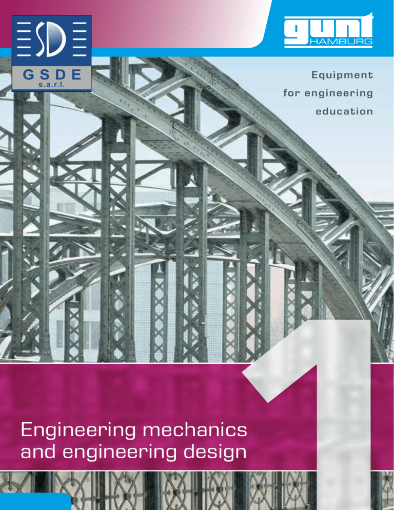 gunt Equipment for engineering education Engineering mechanics and engineering design gunt Welcome to GUNT Contents Engineering mechanics and engineering design In this catalogue, we present a comprehensive ­overview of our innovative demonstration and ­experimental units. Introduction 004 1 Engineering mechanics – statics 008 2 Engineering mechanics – strength of materials 076 3 Engineering mechanics – dynamics 142 4 Machine dynamics 182 5 Engineering design 252 6 Materials testing 314 Index 380 Product overview 386 GUNT units are used for: education in technical professions training and education of technical personnel in trade and industry studies in engineering disciplines Imprint © 2017 G.U.N.T. Gerätebau GmbH. Any reuse, storage, duplication and reproduction of content – even in extracts – is prohibited without the written approval of G.U.N.T. Gerätebau GmbH. GUNT is a registered trademark. This means GUNT products are protected, and subject to copyright. No liability can be accepted for any misprints. Subject to change without notice. Image credits: GUNT Gerätebau GmbH, manufacturers’ photos, Shutterstock. Design & typesetting: Profisatz.Graphics, Bianca Buhmann, Hamburg. Printed on non-chlorinated, environmentally friendly paper. 002 003 gunt Engineering mechanics and engineering design Teaching and learning systems for the fields of engineering mechanics, engineering design, and materials testing Besides mathematical theory and scientific fundamentals, technological principles and engineering design form the foundation of fundamental engineering education. serves as the basis for more in-depth investigations and as such is a pre-requisite for the development of any engineering programme. Studies in the field of engineering are always focused on fundamentals and methodologies from the outset. As studies pro­ gress, the sound fundamental knowledge that has been acquired Well-founded knowledge of the fundamentals is essential in technical development to design complex systems. GUNT units help you to obtain this basic knowledge through hands-on experience. Practical experience in using the various components of the system and its machine elements and materials in a correct and appropriate manner is important. Thus, knowledge derives from practice. Fundamentals and disciplines of engineering skills The development of engineering skills requires fundamental knowledge relating to mathematical and scientific foundations, technological principles and engineering design, originating from What can GUNT do for you? discrete disciplines such as mechanics, physics, thermodynamics and technical design. The figure below illustrates the relation between the fundamental knowledge and the related disciplines. Your success is our goal! Catalogue 1 includes units for demonstrations and experiments, which are helpful for developing the disciplines of engineering mechanics, engineering design, and materials testing. In addition to single units, GUNT has developed series of units that cover a topic entirely. The different units in a series are all built upon each other. Although each unit focuses on a different issue or question, the topics are interrelated and constitute a complete subject area. Mathematical and scientific fundamentals Mathematics Catalogue 1 Physics Catalogue 1 Chemistry Catalogue 5 Materials science Catalogue 1 Mechanics Technological fundamentals Catalogue 1 Thermo­ dynamics Catalogue 3 Electrical engineering Catalogue 2 Engineering skills Measuring methods Catalogue 1 Process contr. engineering Catalogue 2+5c Control engineering Catalogue 2 Computer sciences Design, standardisation Production Catalogue 1 Technical design 004 Business studies, patents, law Improving the people’s quality of life through the development and application of technology. 005 gunt Engineering mechanics and engineering design Teaching and learning systems for the fields of engineering mechanics, engineering design, and materials testing YNAM I ED • forces and moments, axioms of statics • stresses in: tension, pressure, thrust, and torsion • kinematics of a point, kinematics of a rigid body • vibrations in machines MICS, NA DY Machine dynamics Chapter 4 STATIC S Dynamics (kinematics and kinetics) Chapter 3 AND KIN Strength of materials Chapter 2 S Engineering mechanics Statics Chapter 1 NEMATIC KI ICS ET university, which is based on the tables of contents of reference books on engineering mechanics. GUNT units cover most of these topics. CS Students are prepared for a career in engineering by educating them on the basic disciplines of engineering mechanics, machine elements, engineering design, and materials testing. The following table is an excerpt from a typical curriculum of a technical MACHIN Structure of the catalogue • deformations, stresses • beams, trusses, bridges, members • principle of virtual work • energy methods • body dynamics • vibrations • experimental stress and strain analysis • elements of connecting technology • three-dimensional display • bearings • sectional view • transmission /conversion elements • design guidelines • assembly exercises EERING N I • cutaway models Materials testing S ENGIN EL • tensile, pressure, bending, hardness, torsion tests • tribology • impact test • corrosion ELEMEN NE • material fatigue, fatigue limit MACH I • mechanical testing of materials ASSEM B ES | TS EXERCIS LY Materials testing Chapter 6 006 NGS | CU WI WAY MOD TA RING DR A EE • development of spatial perception ENG Machine elements & assembly exercises Chapter 5 SIGN DE Engineering drawings & cutaway models Chapter 5 RIALS T E T TING ES Engineering design TH OF M NG MA STR E • static and kinetic friction • law of elasticity • systems of mass points ERIALS AT • method of sections and internal forces: normal force, shear force, and bending moment • kinetics of the mass point GINEER N E • buckling problems G MECH N 