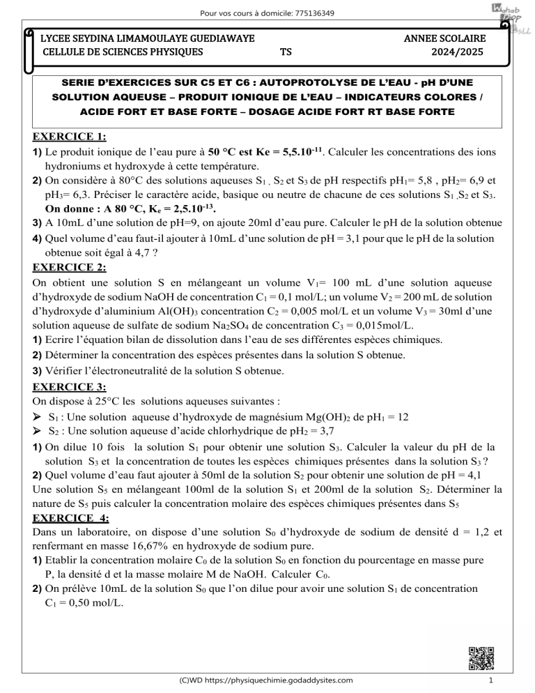 1) Le produit ionique de l’eau pure à 50 °C est Ke = 5,5.10-11. Calculer les concentrations des ions