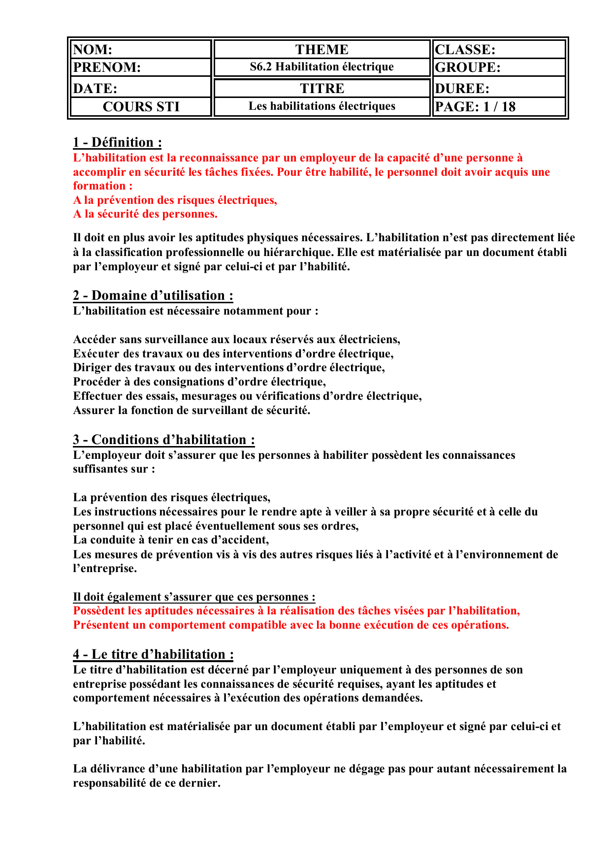 accomplir en sécurité les tâches fixées. Pour être habilité, le personnel doit avoir acquis une