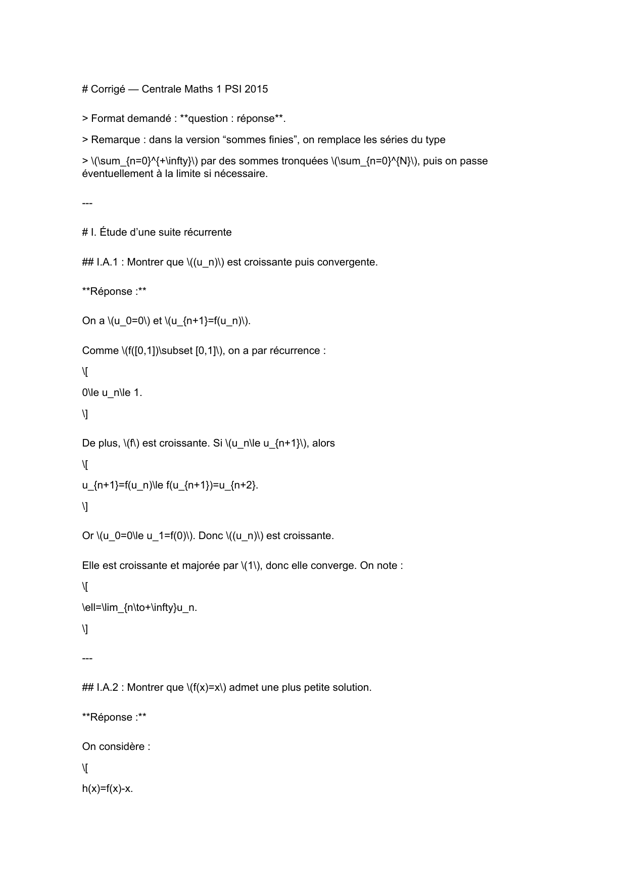 ## I.A.1 : Montrer que \((u_n)\) est croissante puis convergente.