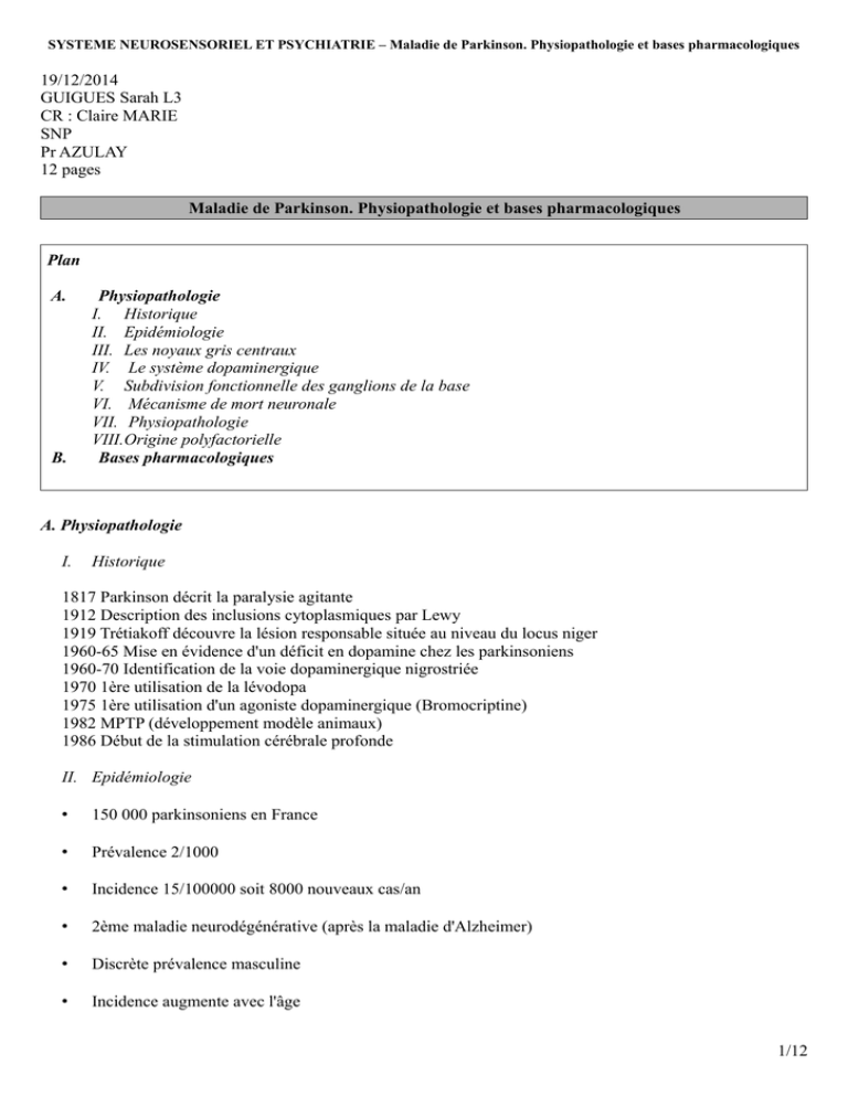 SYSTEME NEUROSENSORIEL ET PSYCHIATRIE – Maladie de Parkinson. Physiopathologie et bases pharmacologiques