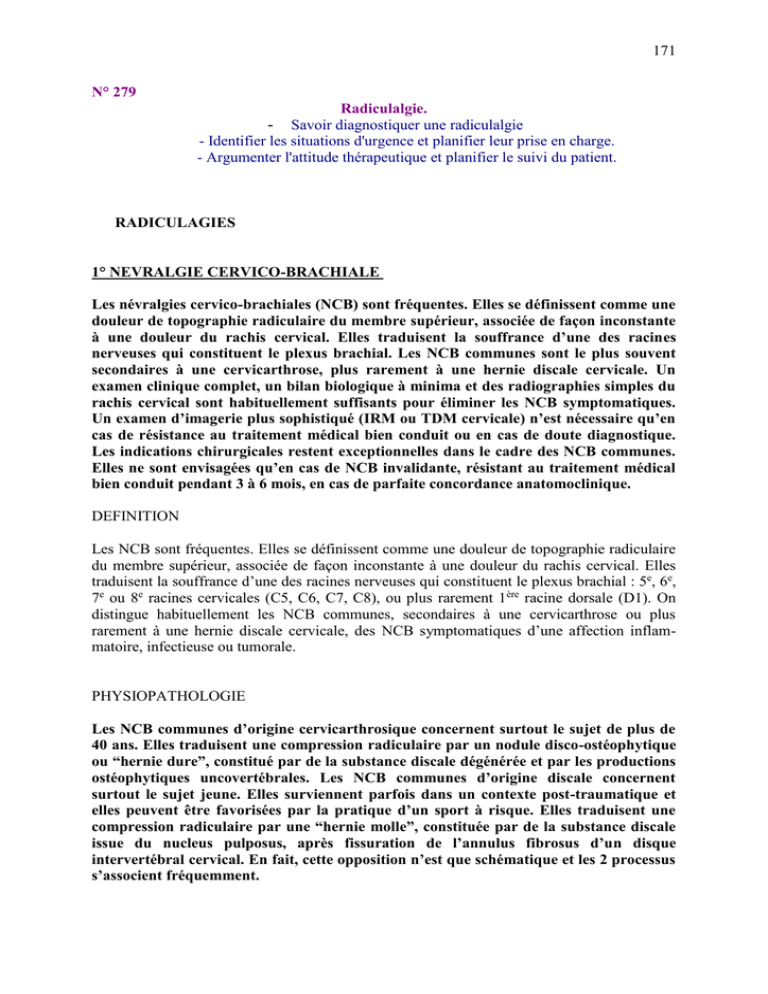 L’interrogatoire précise les caractères de la douleur radiculaire et de la douleur cervicale qui