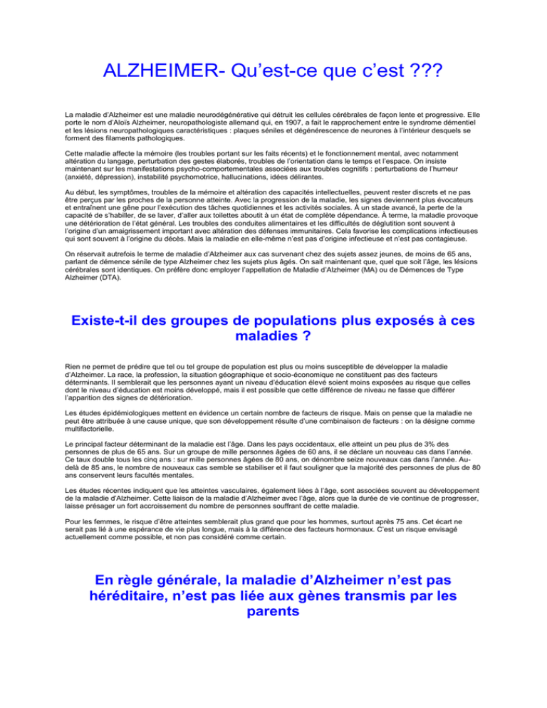 d’Alzheimer. La race, la profession, la situation géographique et socio-économique ne constituent pas des facteurs