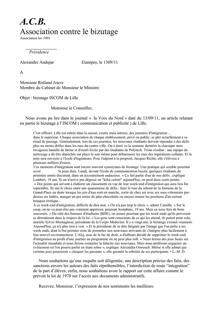en partie le bizutage à l’ISCOM ( communication et publicité ) de Lille.