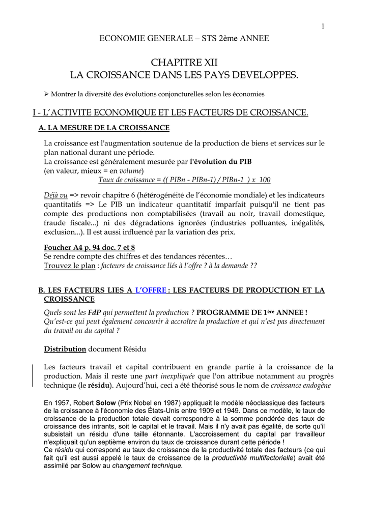 LES FACTEURS DE PRODUCTION ET LA CROISSANCE.