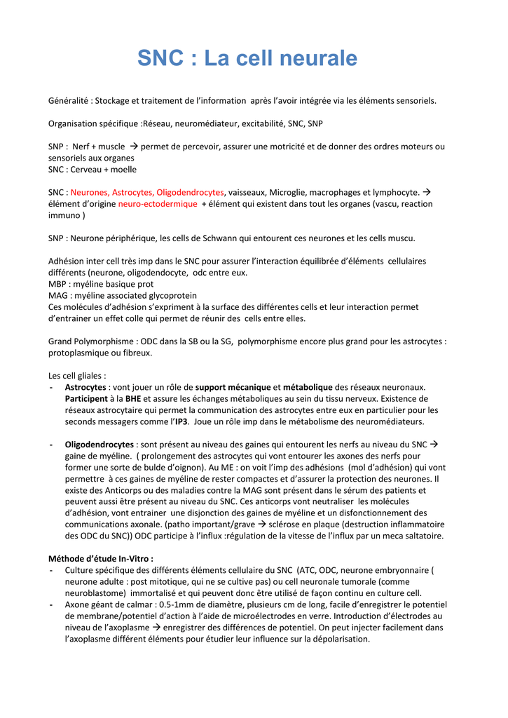 Les neurones : cell excitable (propriété électrique, toutes les cells sont dépolarisables mais les neurones