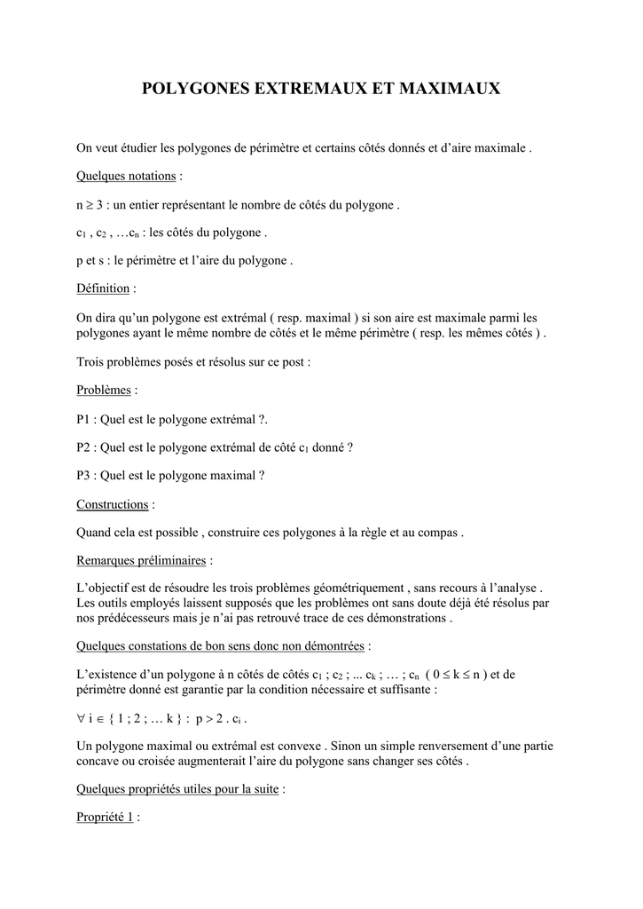 Le polygone extrémal à n côtés , de côté c1 et de périmètre p est le polygone inscriptible de