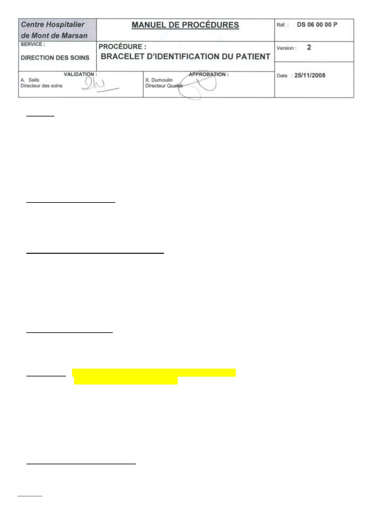 Procédure : « Bracelet d’identification» - DS 06 00 00 P – Version 2 du 25/11/2008