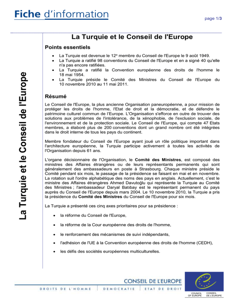 parlementaire du Conseil de l'Europe. La Turquie est représentée à l'Assemblée par une