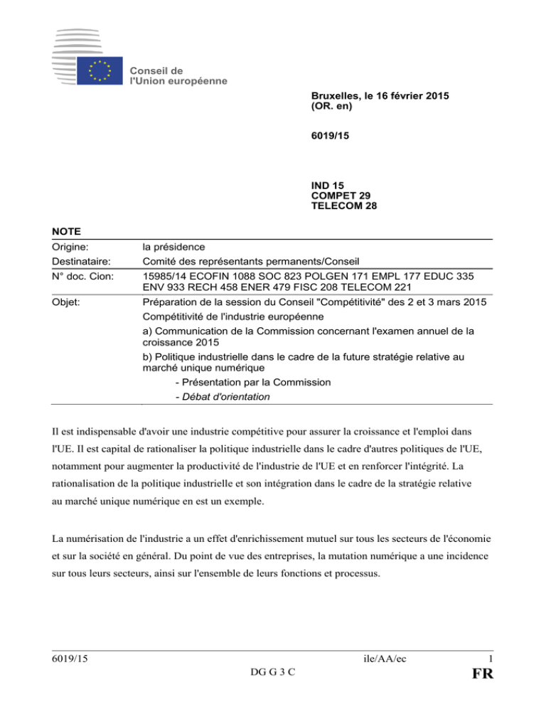 numérique devrait être diffusée avant le Conseil européen de juin 2015.