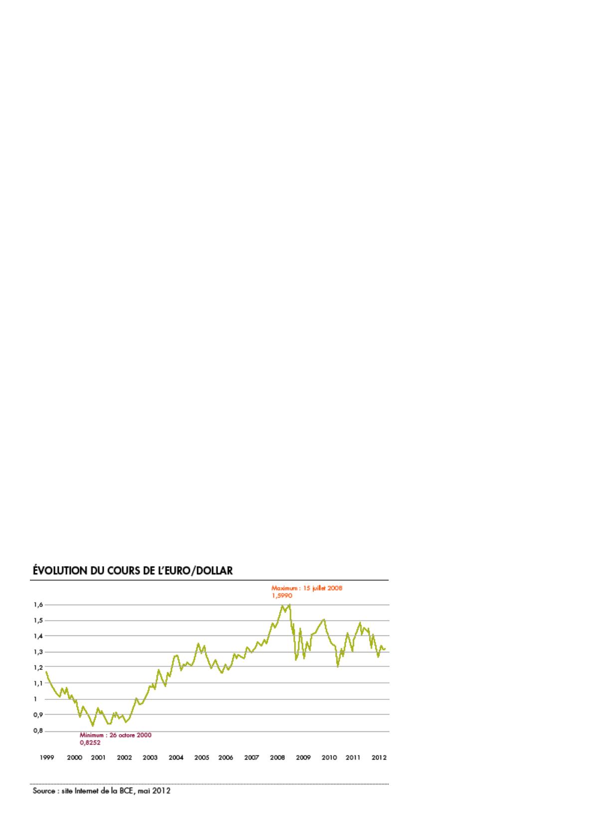 le taux de change de l’euro par rapport au dollar augmente et passe de 1€=1,35$ à 1€=1,50$ quelques