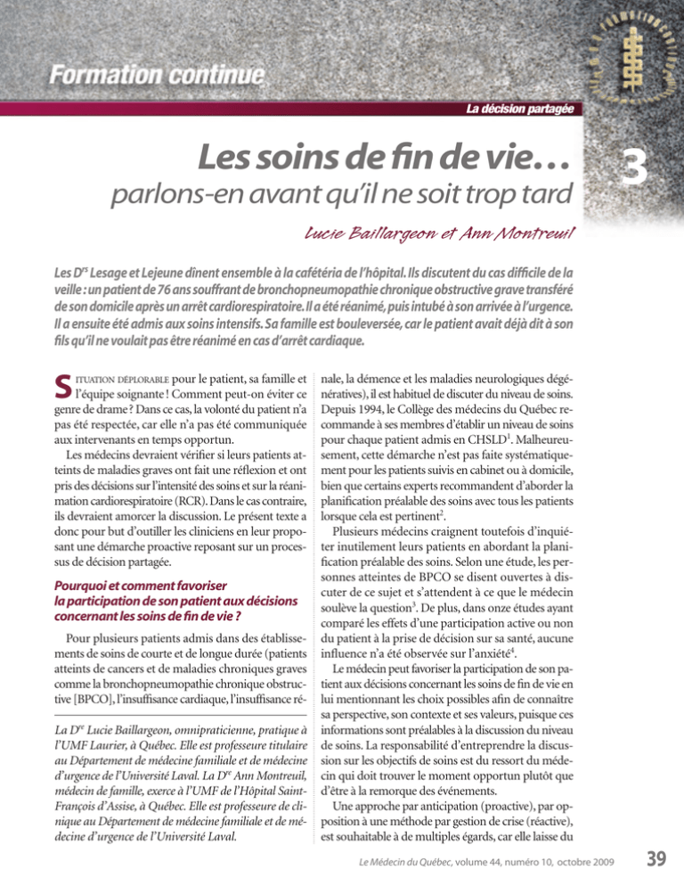 La responsabilité d’entreprendre la discussion sur les objectifs de soins est du ressort du médecin