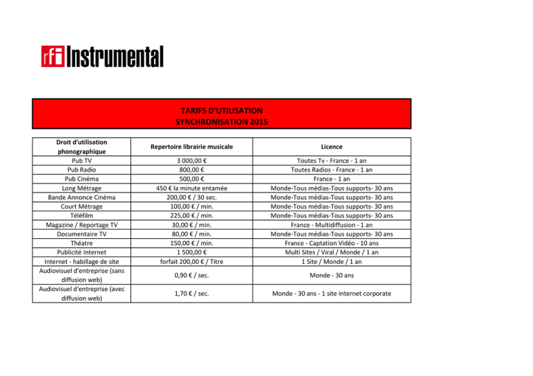 Long Métrage 450 € la minute entamée Monde-Tous médias-Tous supports- 30 ans