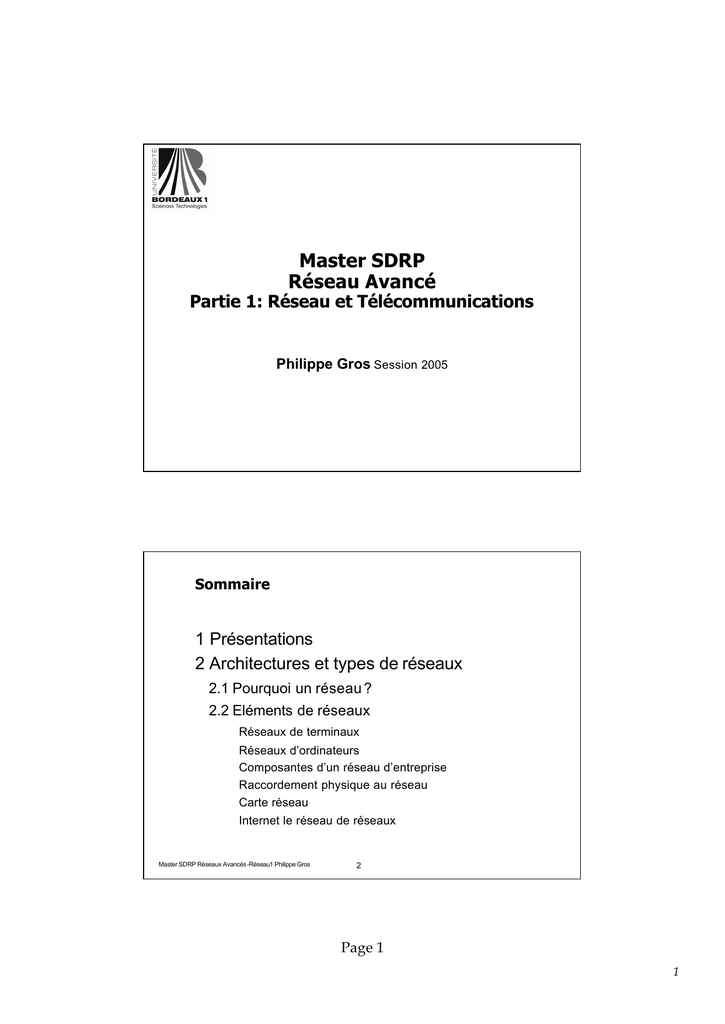 Master SDRP Réseaux Avancés-Réseau1 Philippe Gros 2