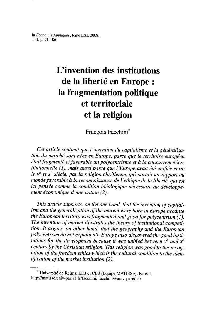 (Raico 1994). L'Europe a évité les systèmes politiques centralisés ins-
